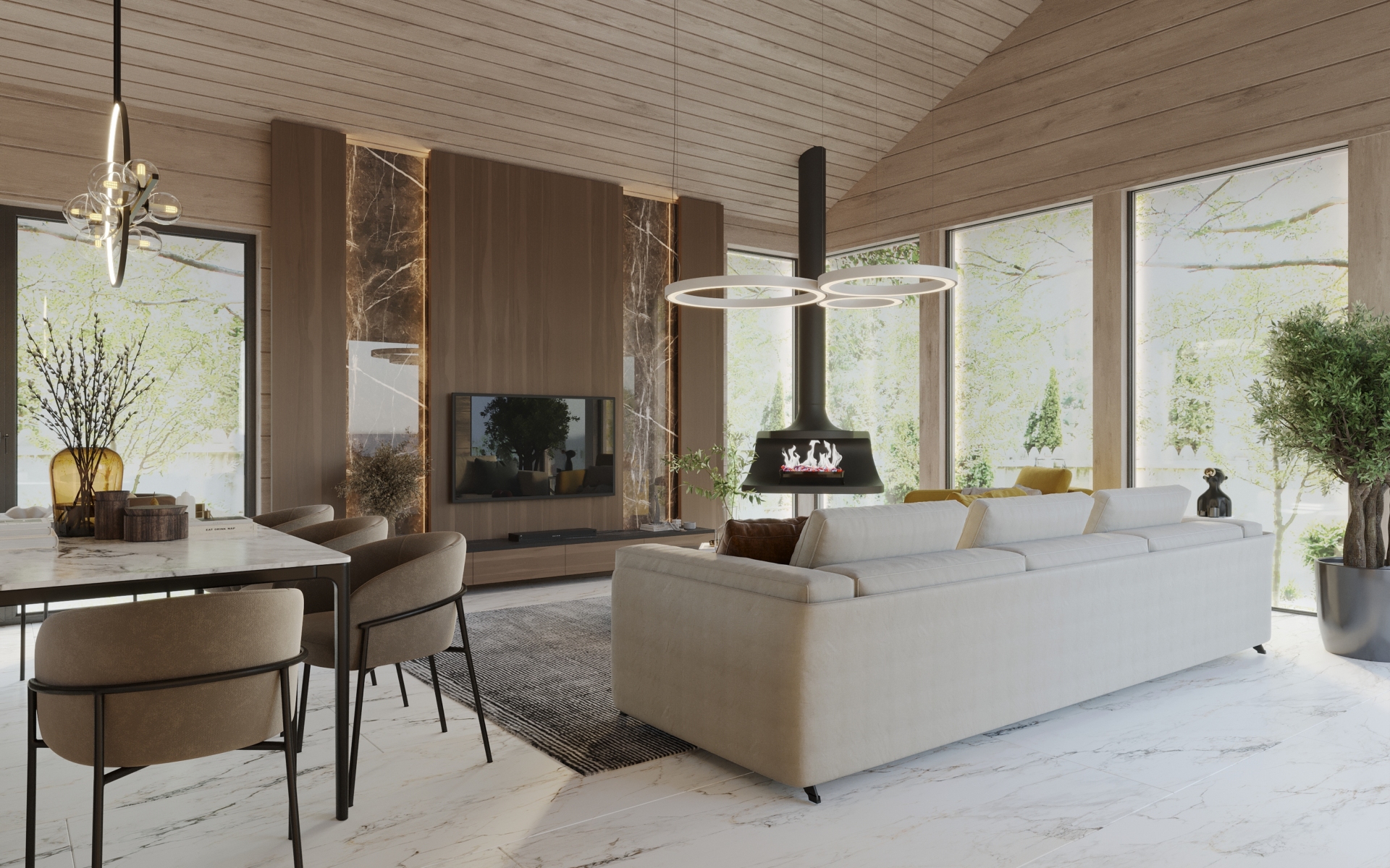 Tästä syystä kaksikerroksisen talon alakertaan sijoitettiin yhteinen oleskelualue, jonka jokaisesta huoneesta avautuu näkymä merelle.