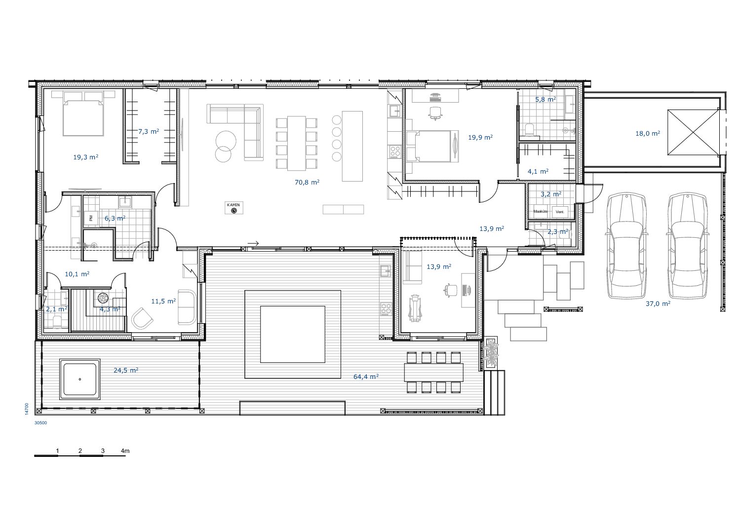 Rakennuksen kaksi siipeä muodostavat yksityisen sisäpihan, johon avautuu näkymä olohuoneesta. Lämpimänä vuodenaikana perhe ja vieraat kutsutaan koolle terassin oleskelualueelle. Terassilta löytyy myös suojaisa ruokailutila.