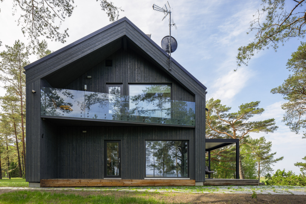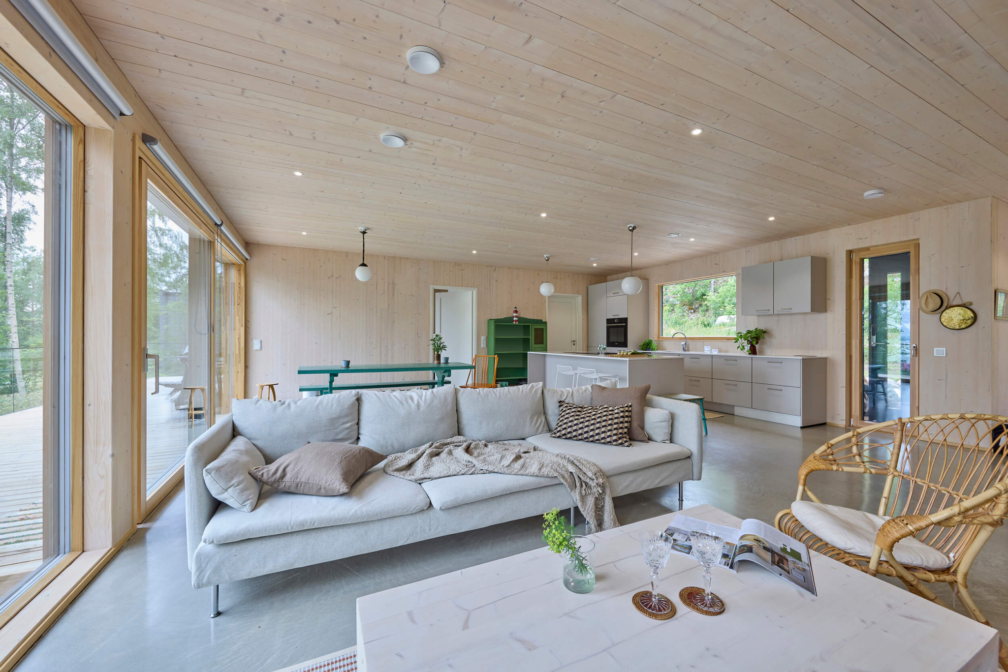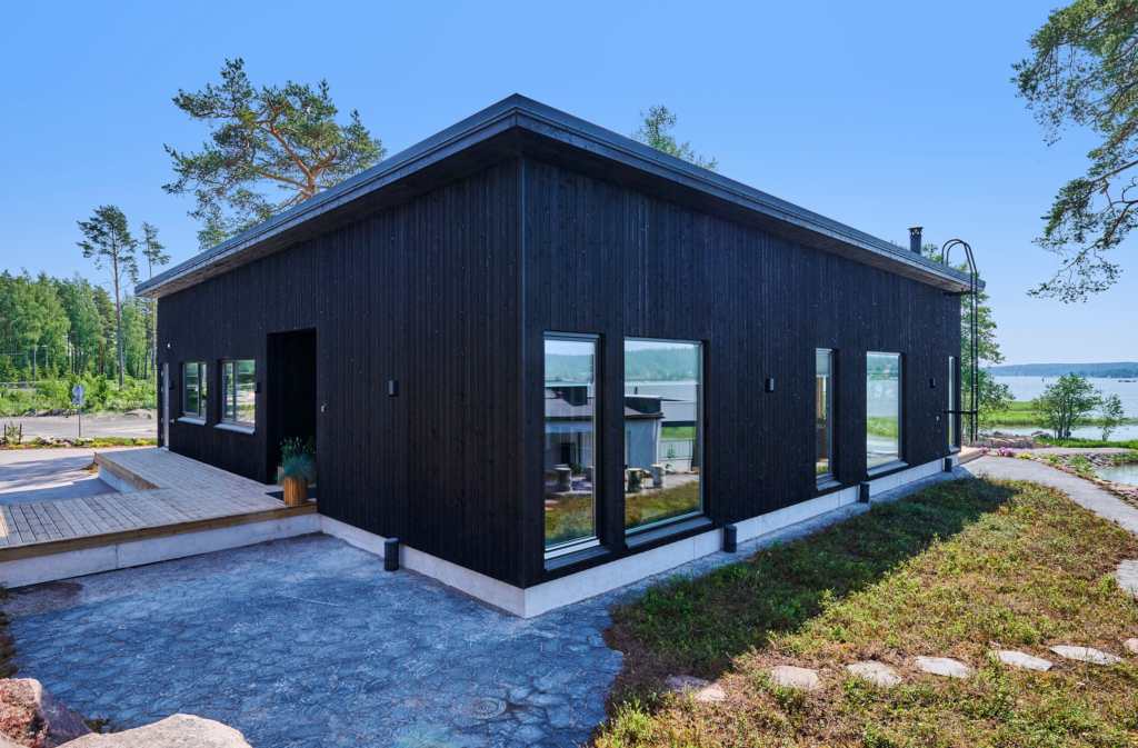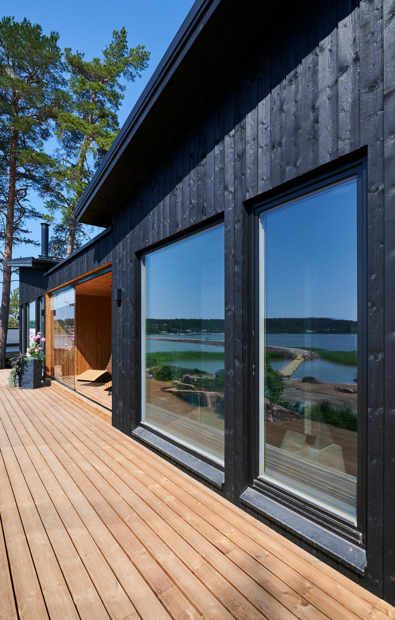 Tämän upea CLT-huvila sijaitsee idyllisissä merenrantamaisemissa Etelä-Suomessa. 126 neliöisen huvilan runko sekä väliseinät ovat CLT:tä. Julkisivuverhoilu saa miellyttävän ilmeensä lämpökäsitellystä saarnipaanusta. Näyttävät lasipinnat on integroitu CLT-runkoon. Talon huomiota herättävin yksityiskohta, talon päädyn kokoinen lasiseinä, on toteutettu timber frame -tekniikalla. Muita kiinnostavia yksityiskohtia huvilassa ovat porapaaluperustus tuulettuvalla alapohjalla, hoikat ja sirot teräspilarit ja -palkit terassikatosten rakenteina sekä painovoimainen ilmanvaihto paikalla muuratuin hormein.