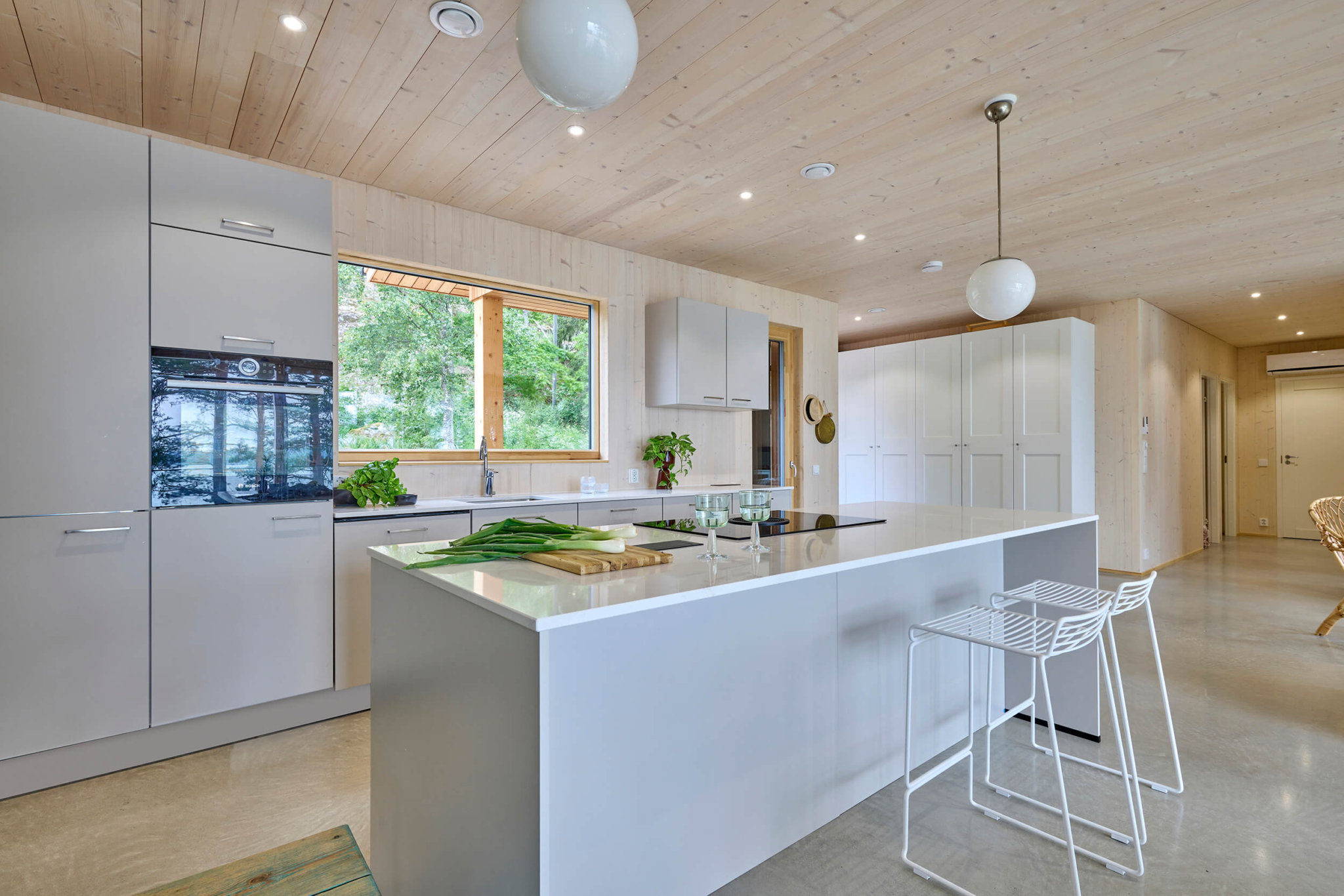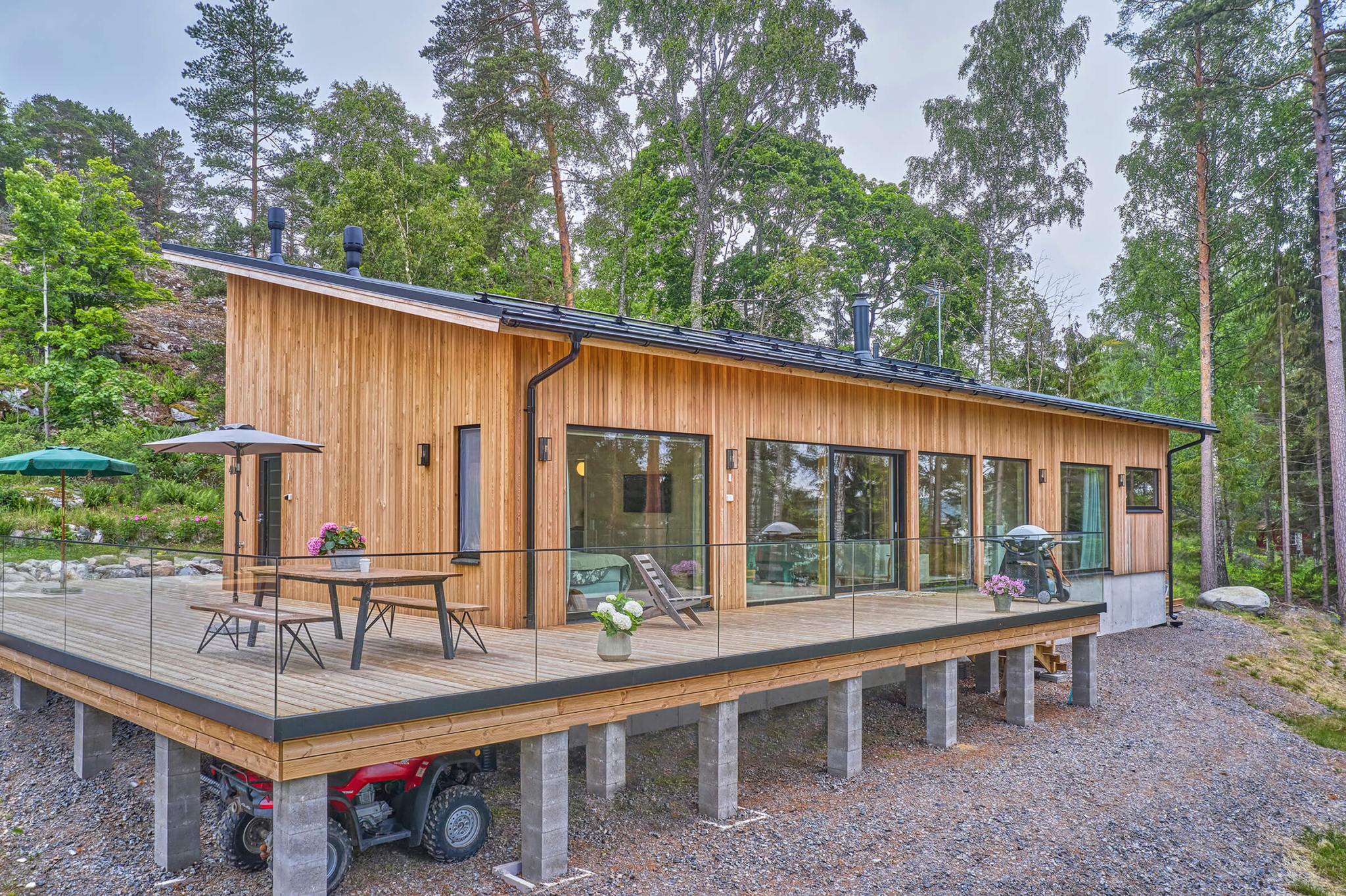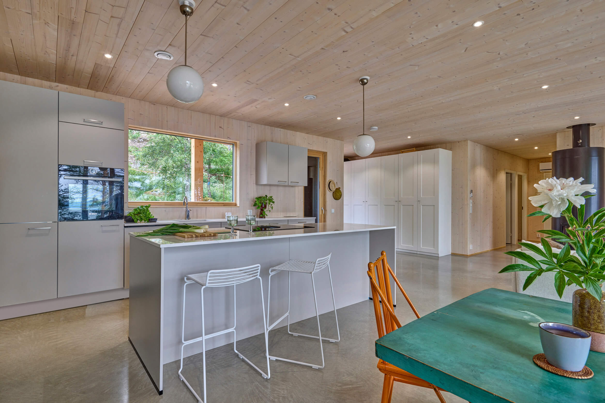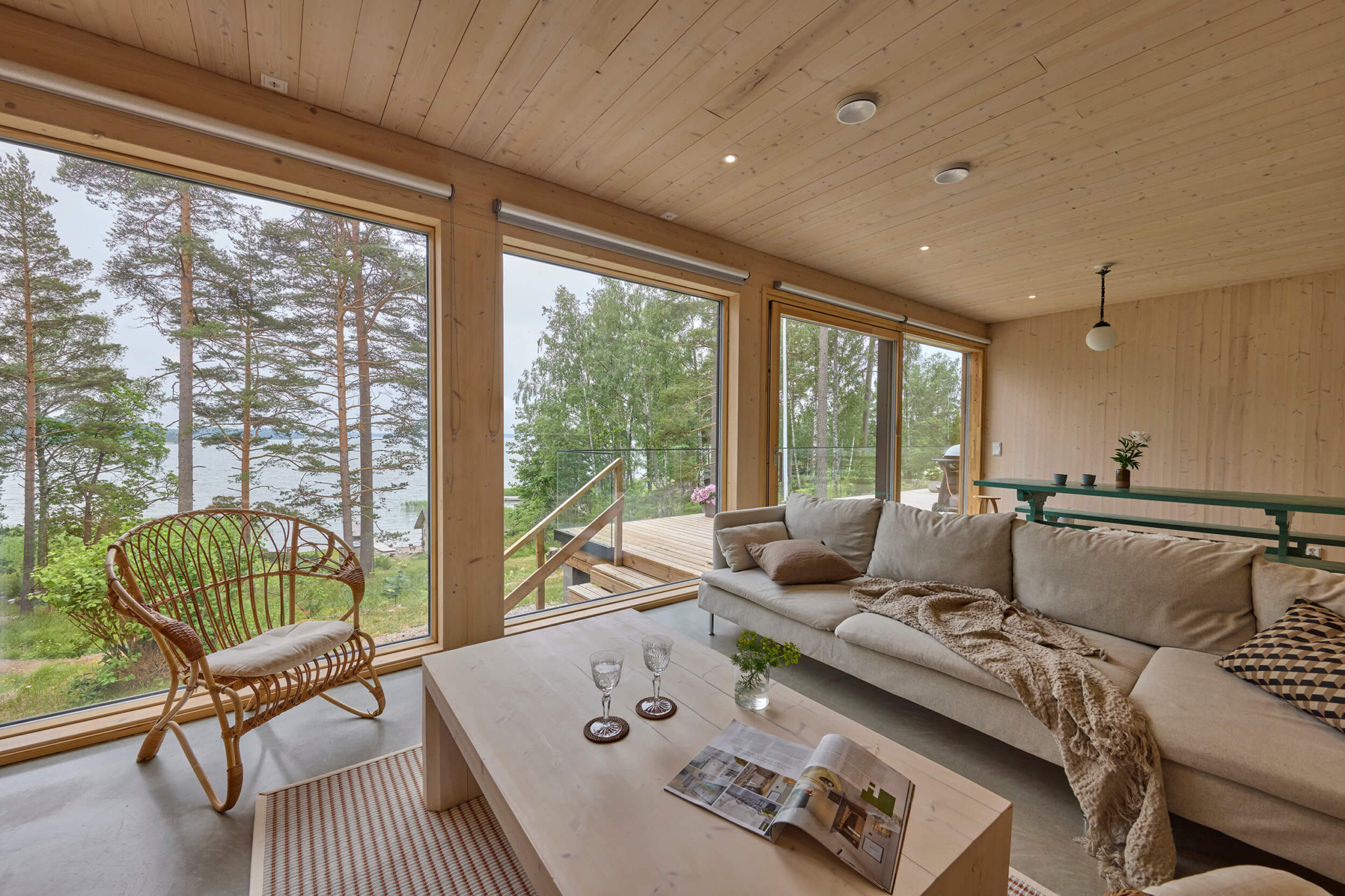 Tämän upea CLT-huvila sijaitsee idyllisissä merenrantamaisemissa Etelä-Suomessa. 126 neliöisen huvilan runko sekä väliseinät ovat CLT:tä. Julkisivuverhoilu saa miellyttävän ilmeensä lämpökäsitellystä saarnipaanusta. Näyttävät lasipinnat on integroitu CLT-runkoon. Talon huomiota herättävin yksityiskohta, talon päädyn kokoinen lasiseinä, on toteutettu timber frame -tekniikalla. Muita kiinnostavia yksityiskohtia huvilassa ovat porapaaluperustus tuulettuvalla alapohjalla, hoikat ja sirot teräspilarit ja -palkit terassikatosten rakenteina sekä painovoimainen ilmanvaihto paikalla muuratuin hormein.