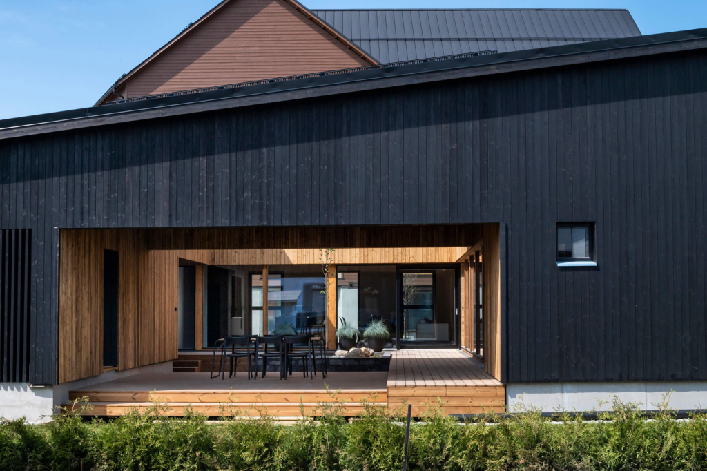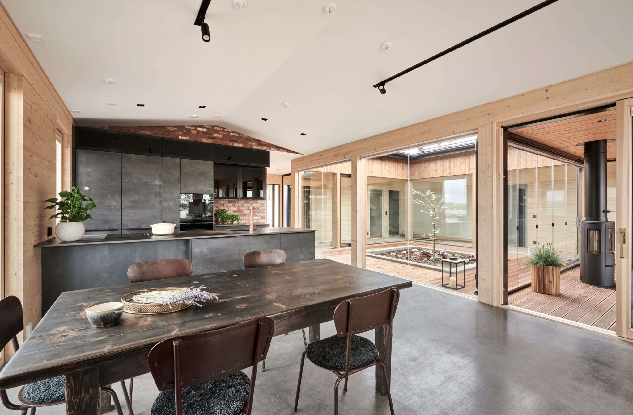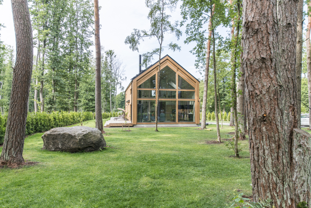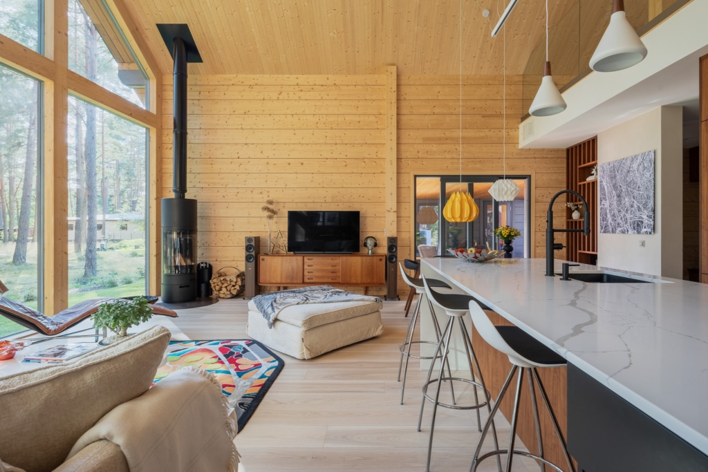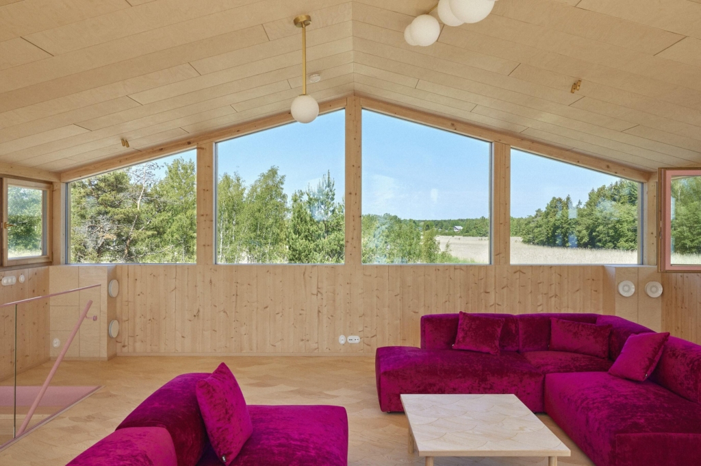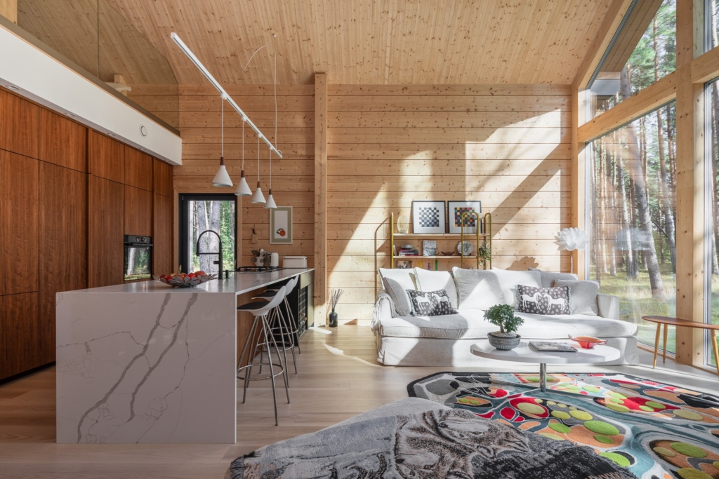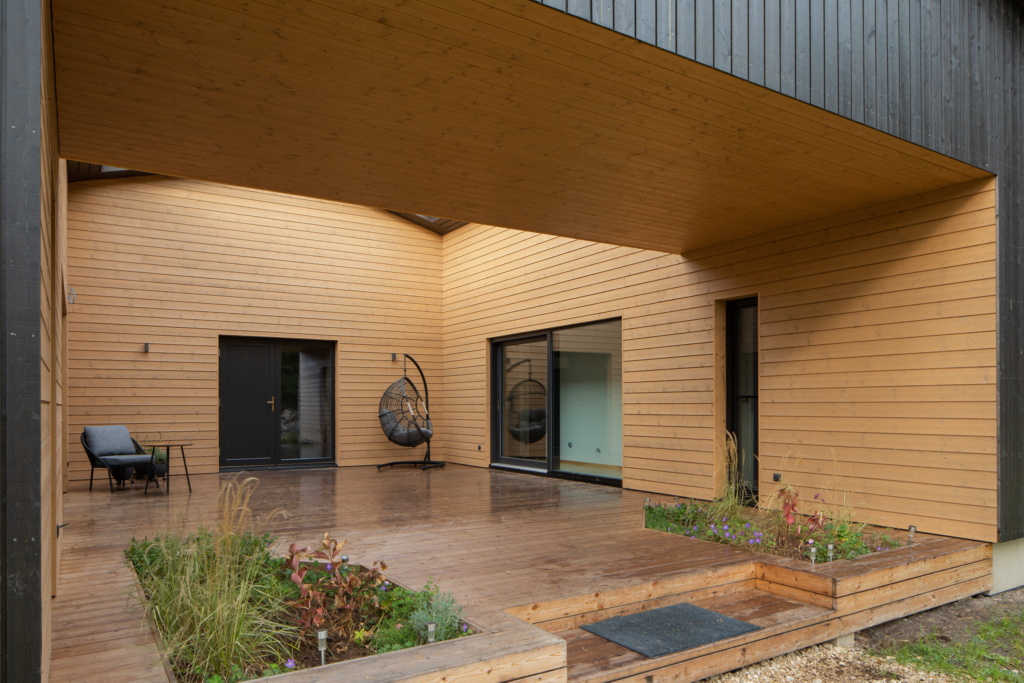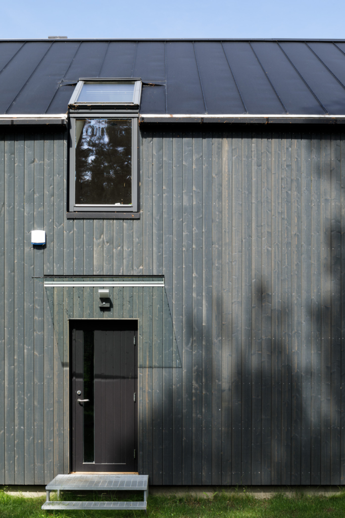 Moderni, aumakattoinen rakennus on valmistettu 100-prosenttisesti puusta - sekä ulko- että sisäseinät ovat puuta. CLT valittiin rakennusmateriaaliksi perheen aikuisen pojan, Petrin, ehdotuksesta.