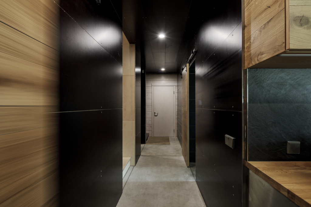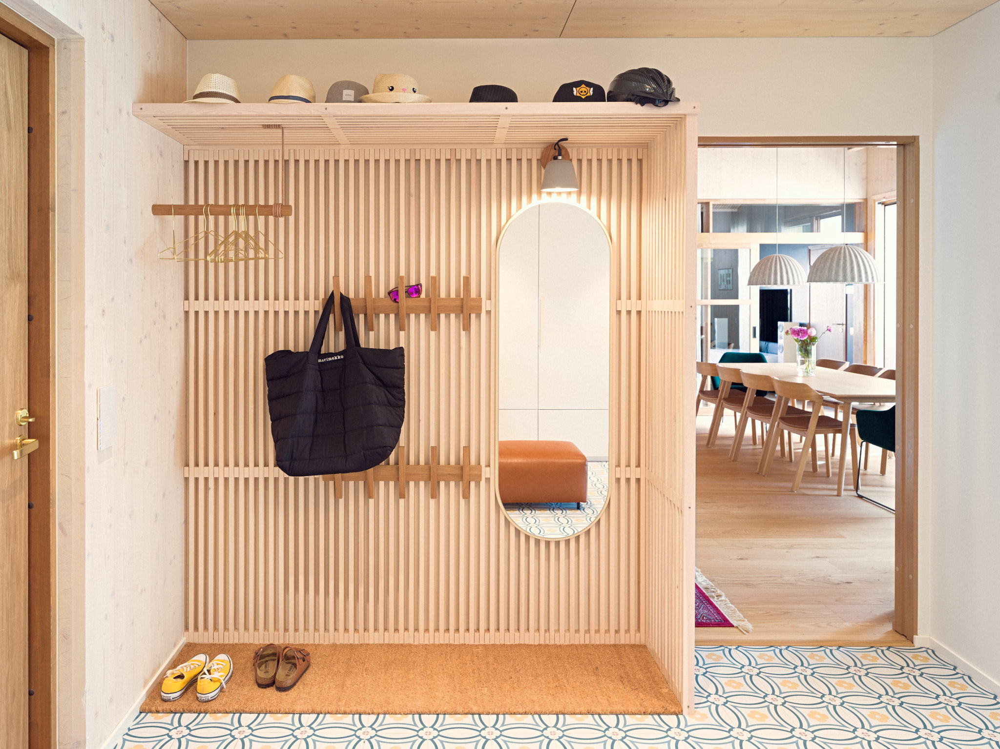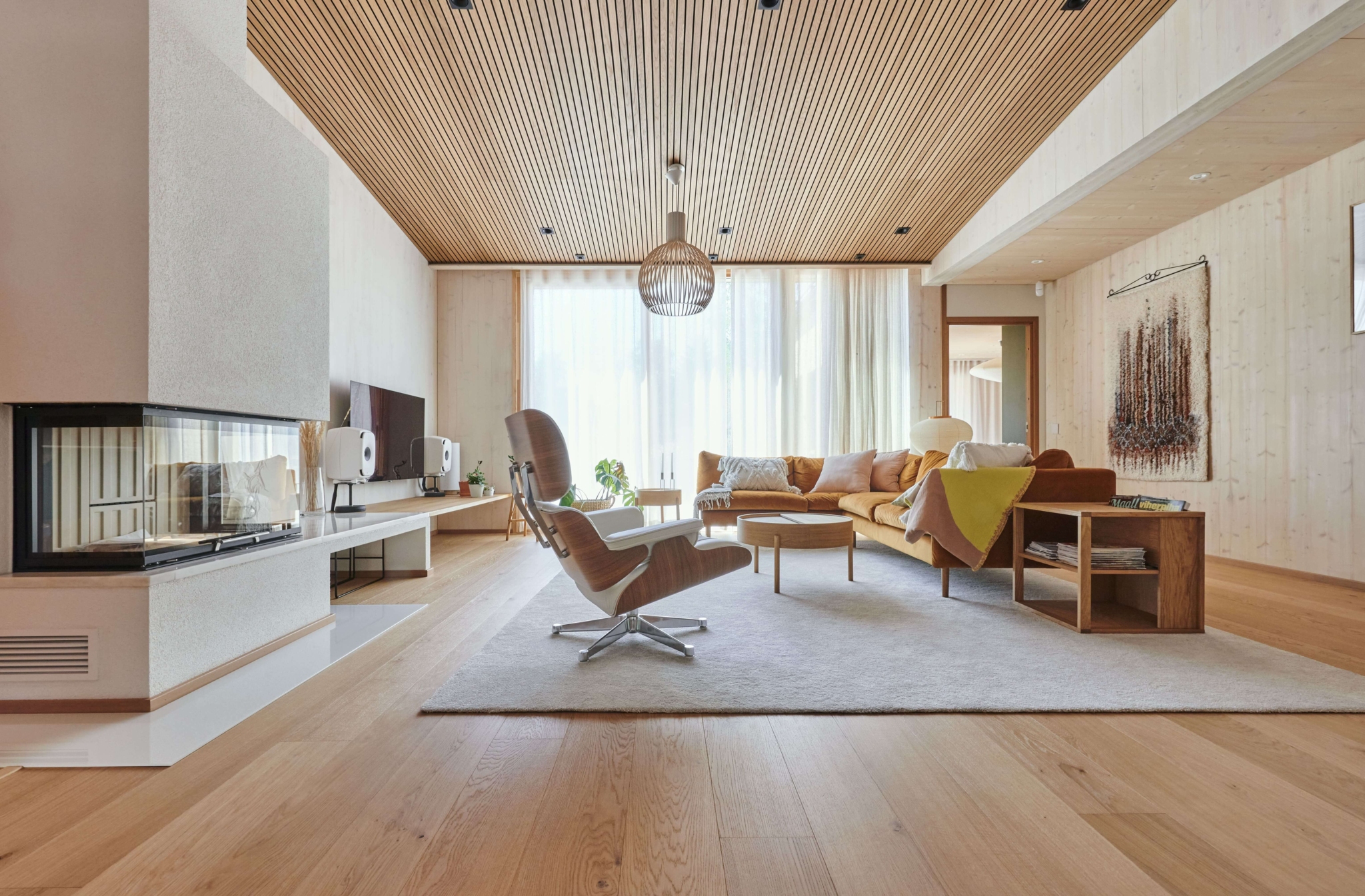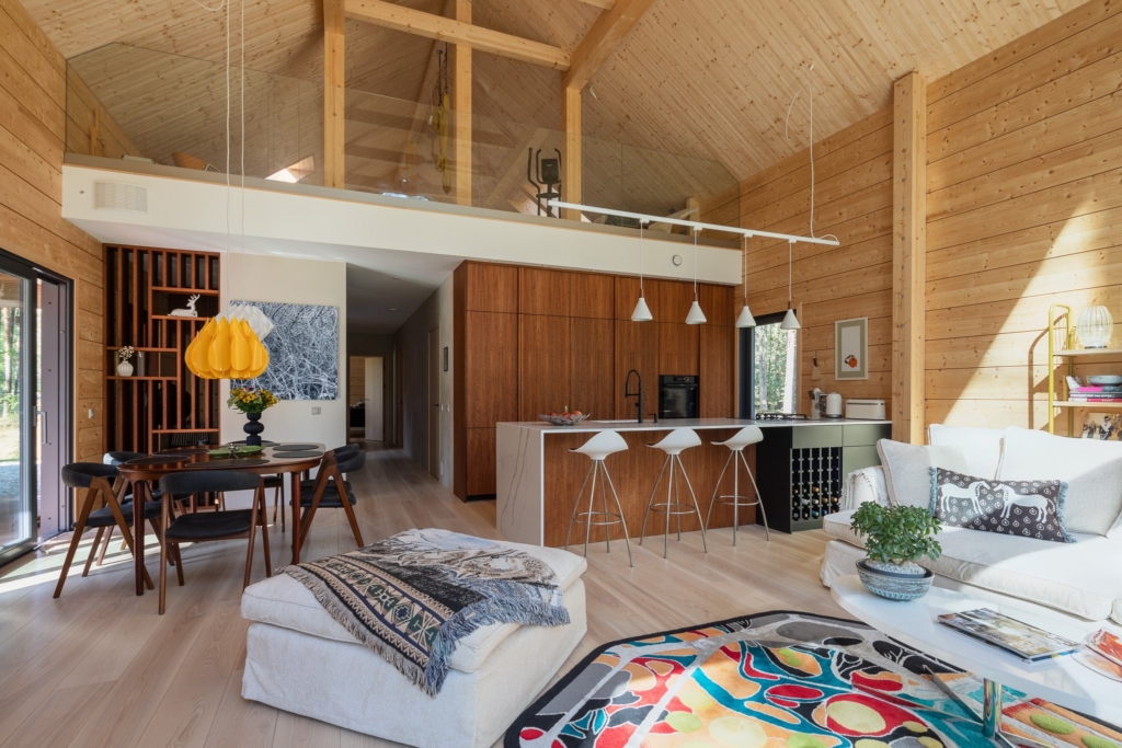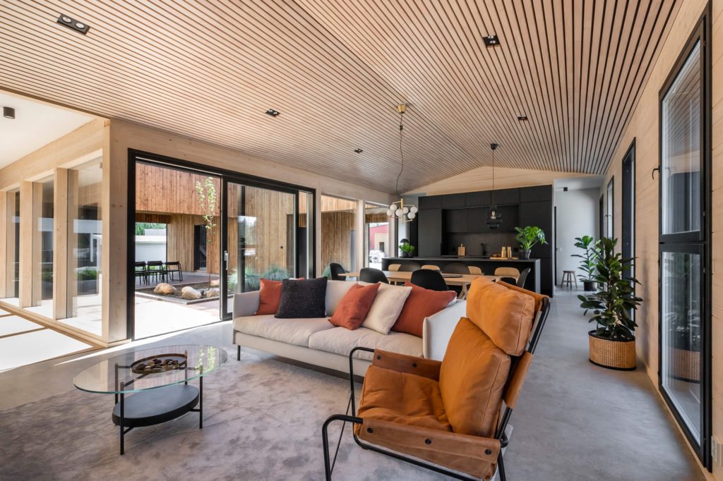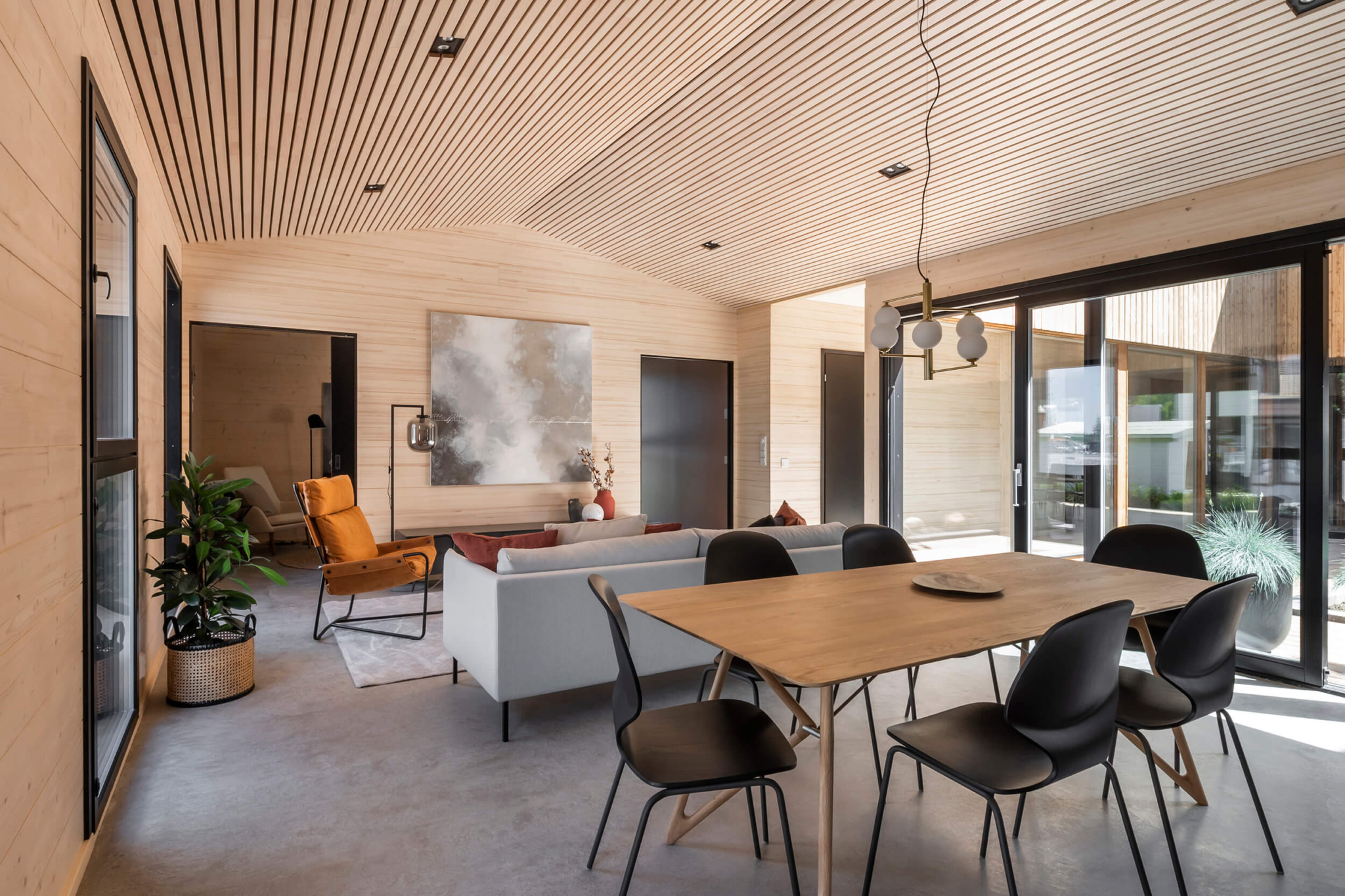 Moderni, aumakattoinen rakennus on valmistettu 100-prosenttisesti puusta - sekä ulko- että sisäseinät ovat puuta. CLT valittiin rakennusmateriaaliksi perheen aikuisen pojan, Petrin, ehdotuksesta.