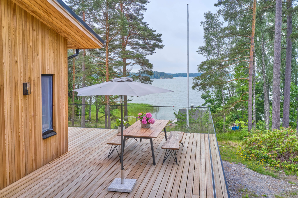 Avaran sisätilan lisäksi aikaa voi viettää myös terassilla, joka ympäröi taloa kolmelta sivulta.