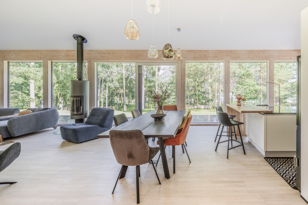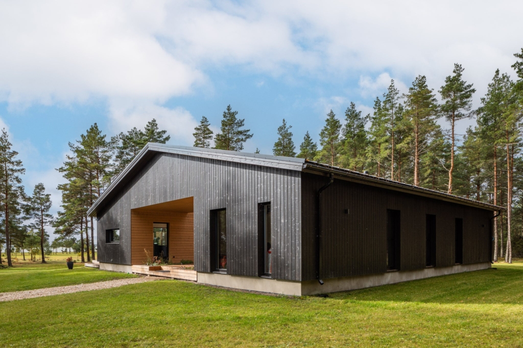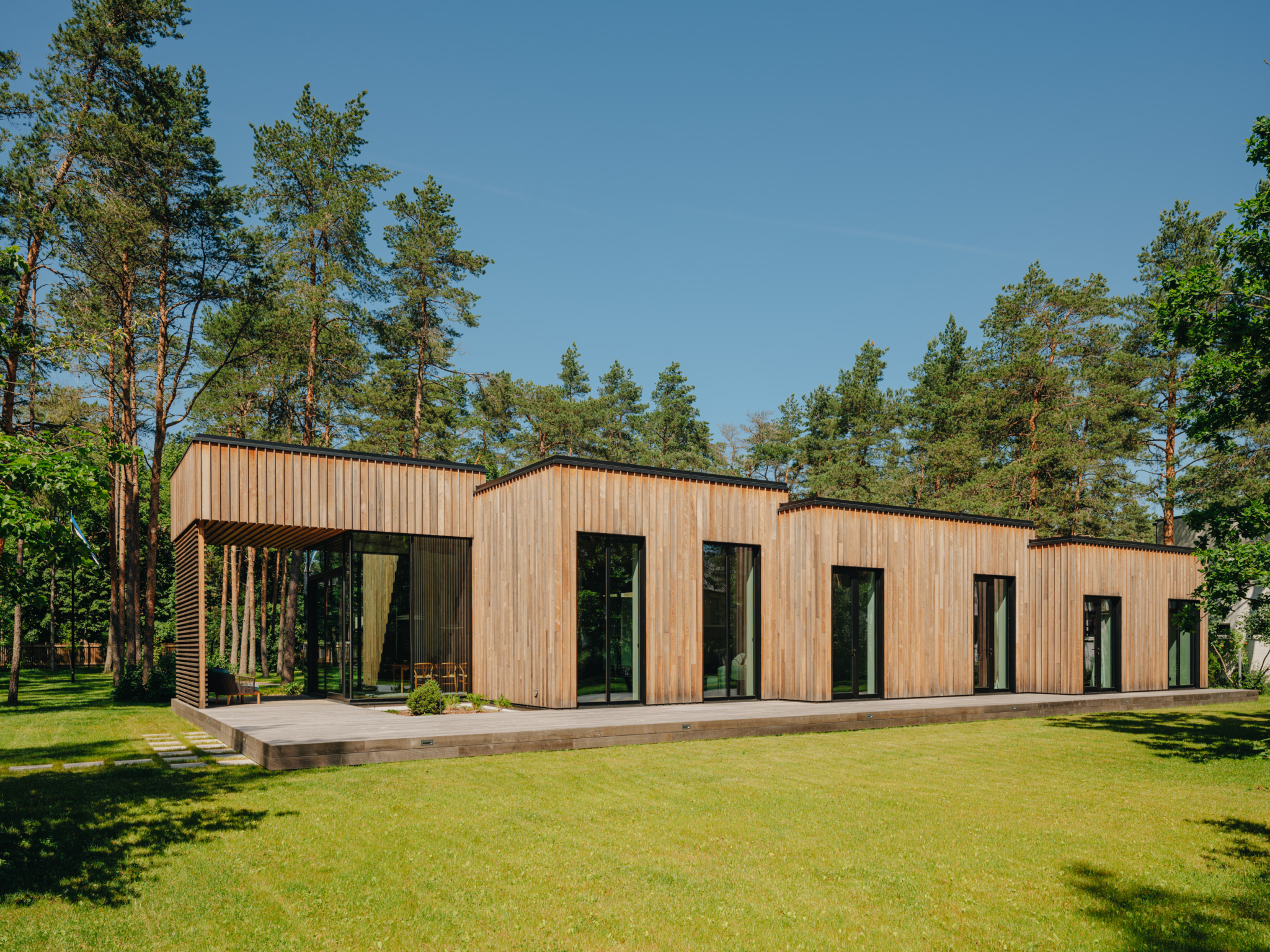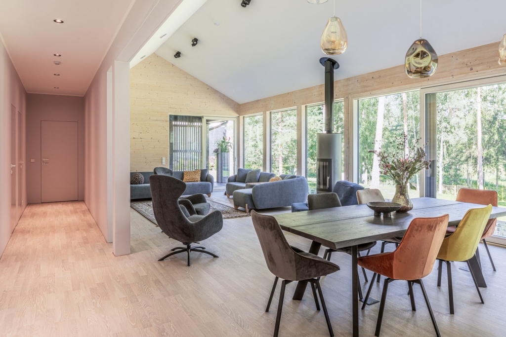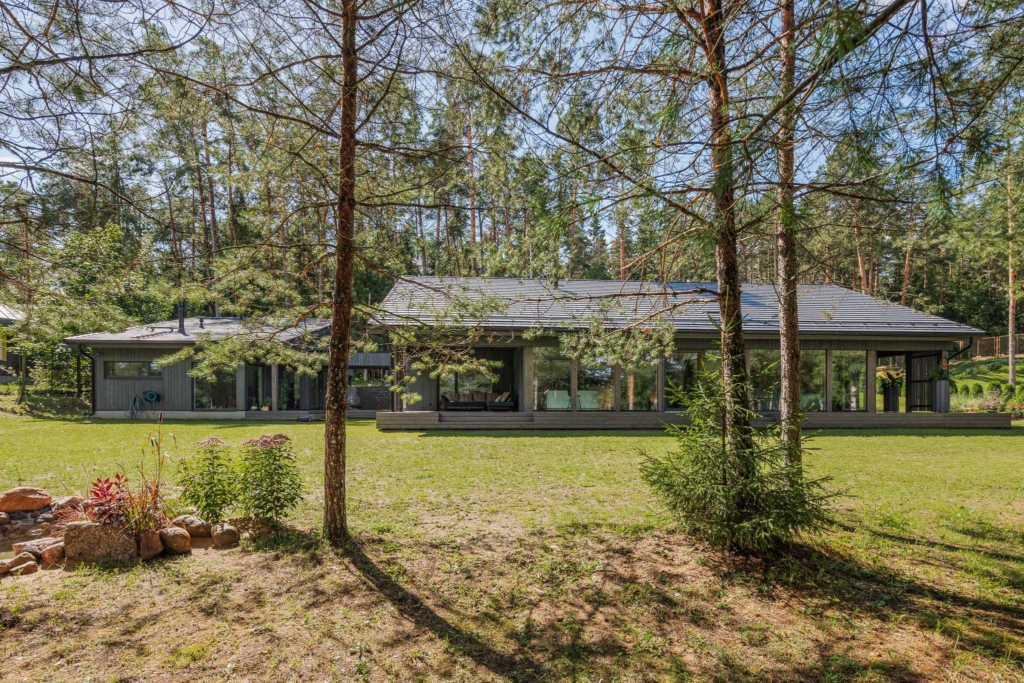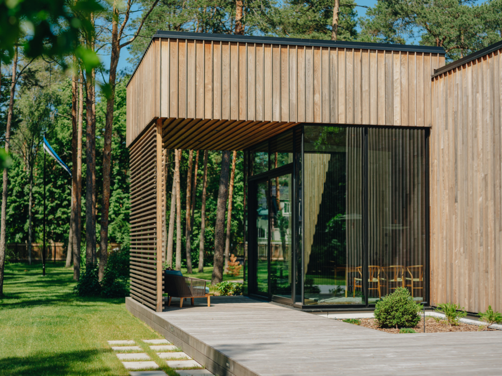Rakensimme persoonallisen omakotitalon Viron Nõmmen alueen tyypilliseen männikkömaisemaan, jossa korkeat puut kehystävät näkymiä ja valo piirtää ympäristöönsä ainutlaatuisen tunnelman vuodenajasta riippumatta. Tontin tavallista suurempi koko mahdollisti ratkaisun, joka on harvinainen alueella: avaran yksikerroksisen kodin, jossa kaikki tilat levittäytyvät maan tasoon ja yhteys luontoon säilyy esteettömänä.