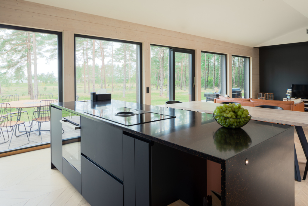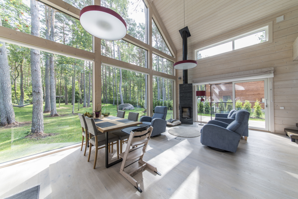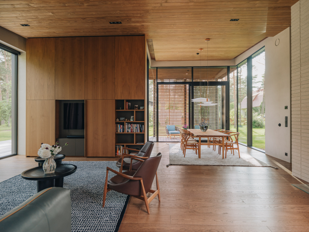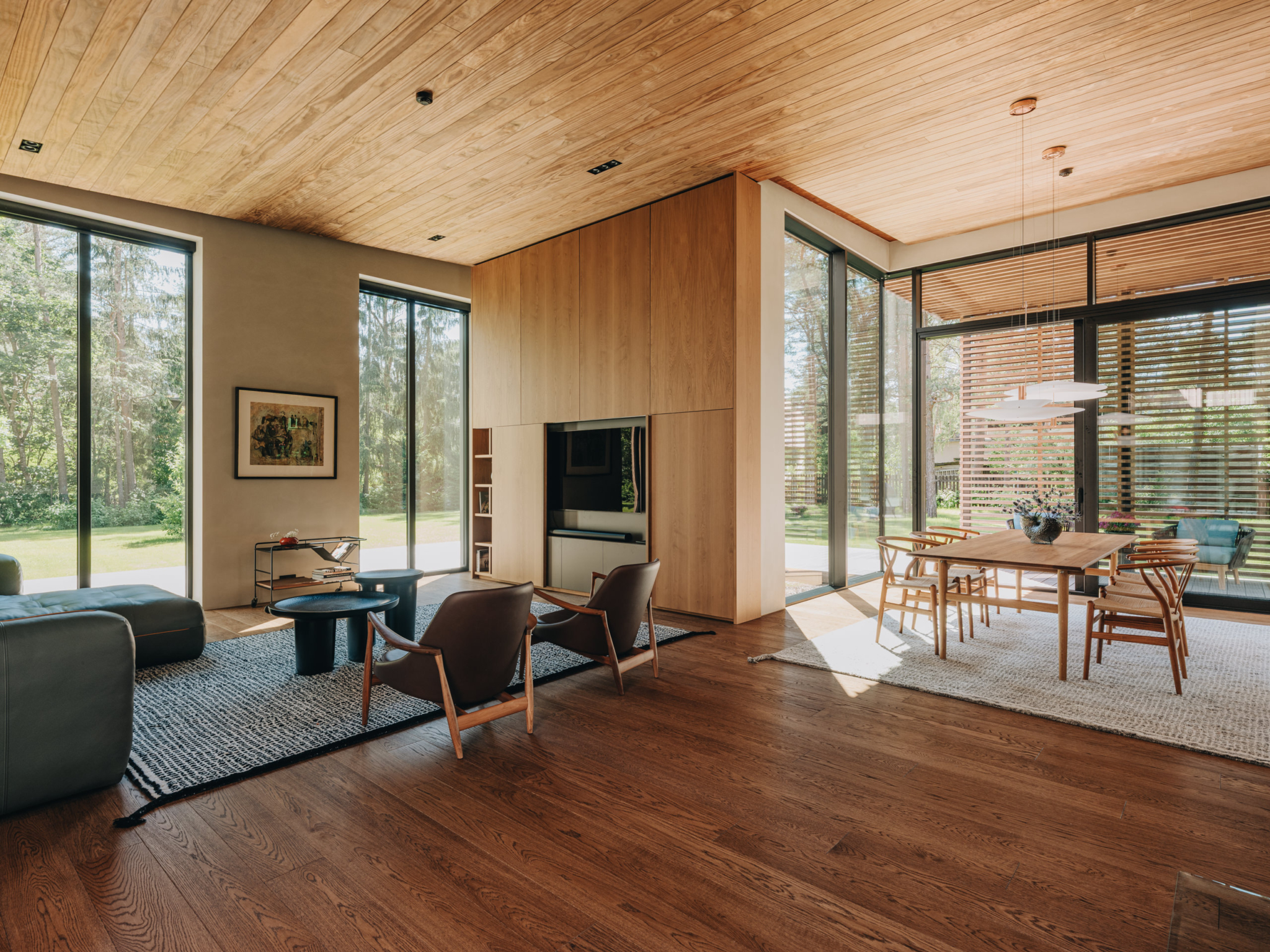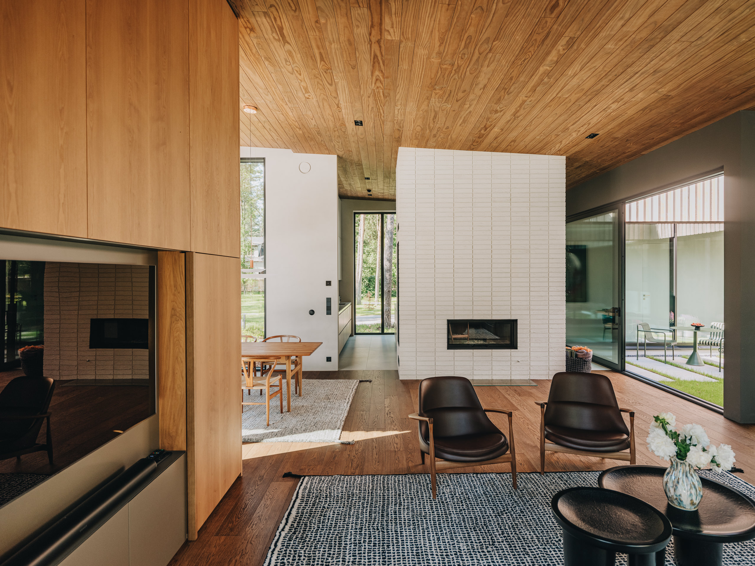 Rakensimme persoonallisen omakotitalon Viron Nõmmen alueen tyypilliseen männikkömaisemaan, jossa korkeat puut kehystävät näkymiä ja valo piirtää ympäristöönsä ainutlaatuisen tunnelman vuodenajasta riippumatta. Tontin tavallista suurempi koko mahdollisti ratkaisun, joka on harvinainen alueella: avaran yksikerroksisen kodin, jossa kaikki tilat levittäytyvät maan tasoon ja yhteys luontoon säilyy esteettömänä.