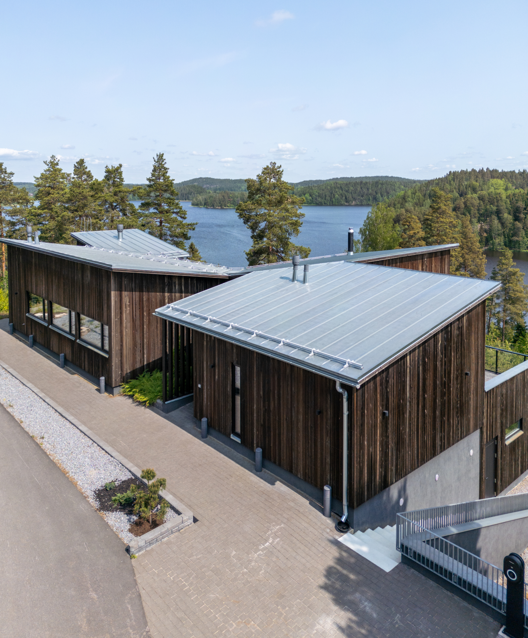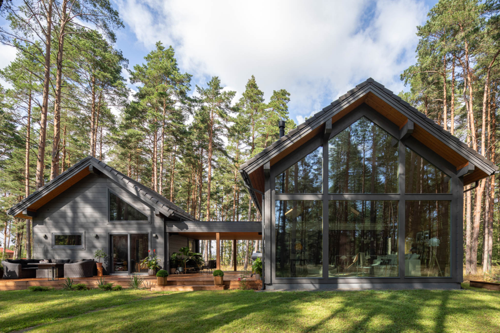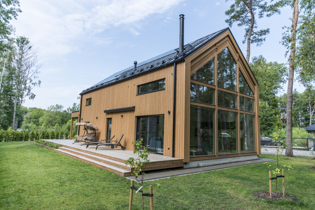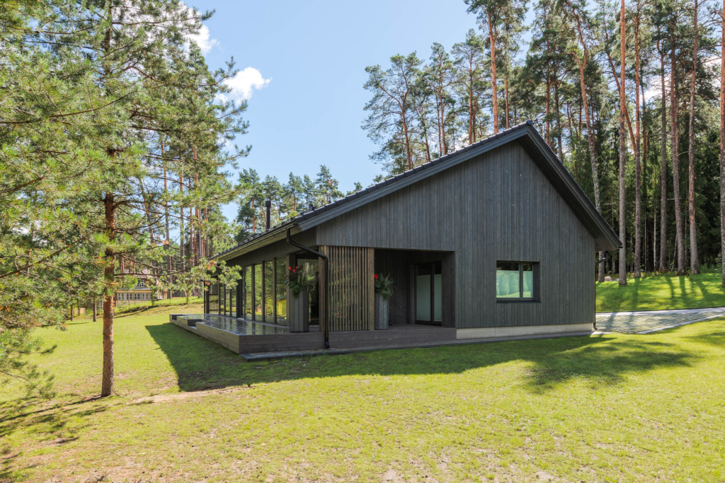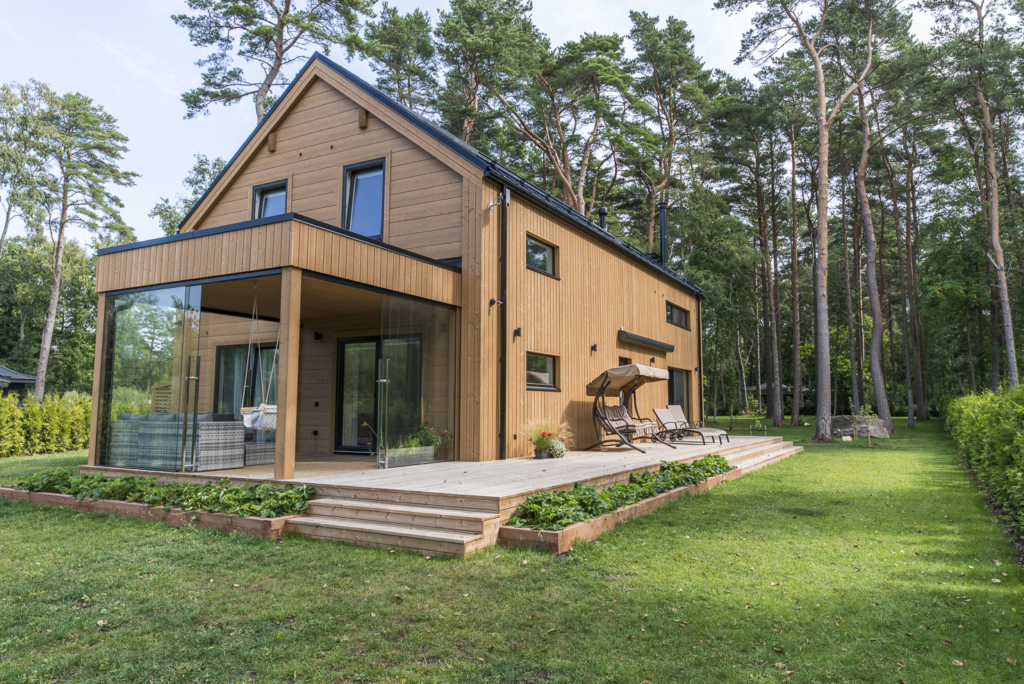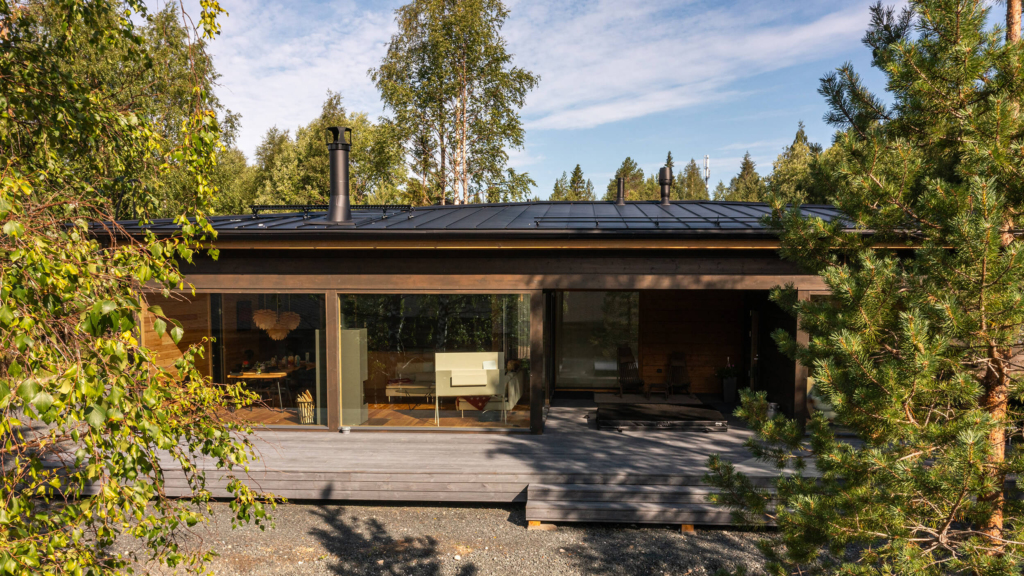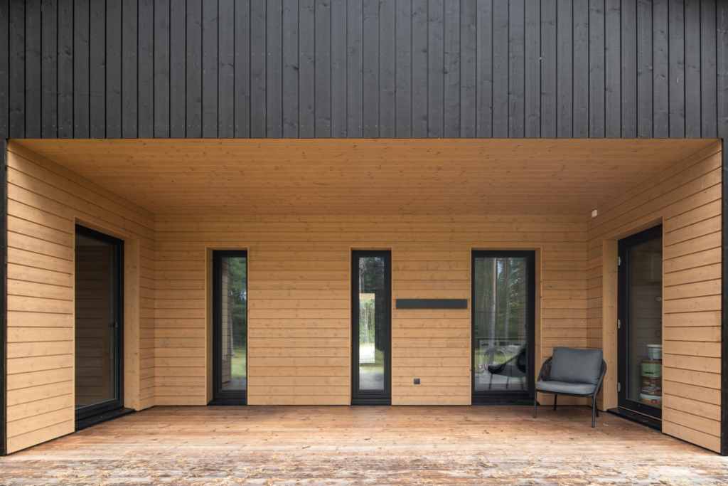 Rakennus on toteutettu laadukkaasta puusta, kantavat rakenteet ovat CLT:tä. Julkisivut ja terassit on verhoiltu lämpökäsitellyllä saarnilla, jonka sävy sulautuu täydellisesti ympäröivään mäntymetsään. Ajan myötä puu saa arvokkaan hopeanharmaan patinan, joka tekee talosta yhä luonnollisemman osan maisemaa.