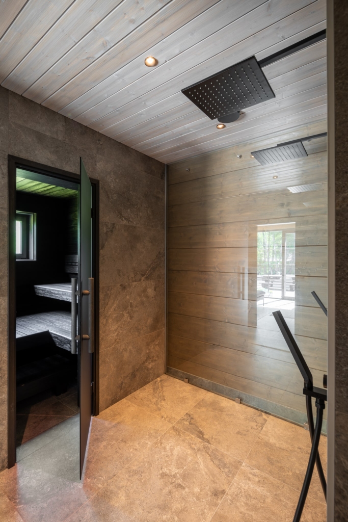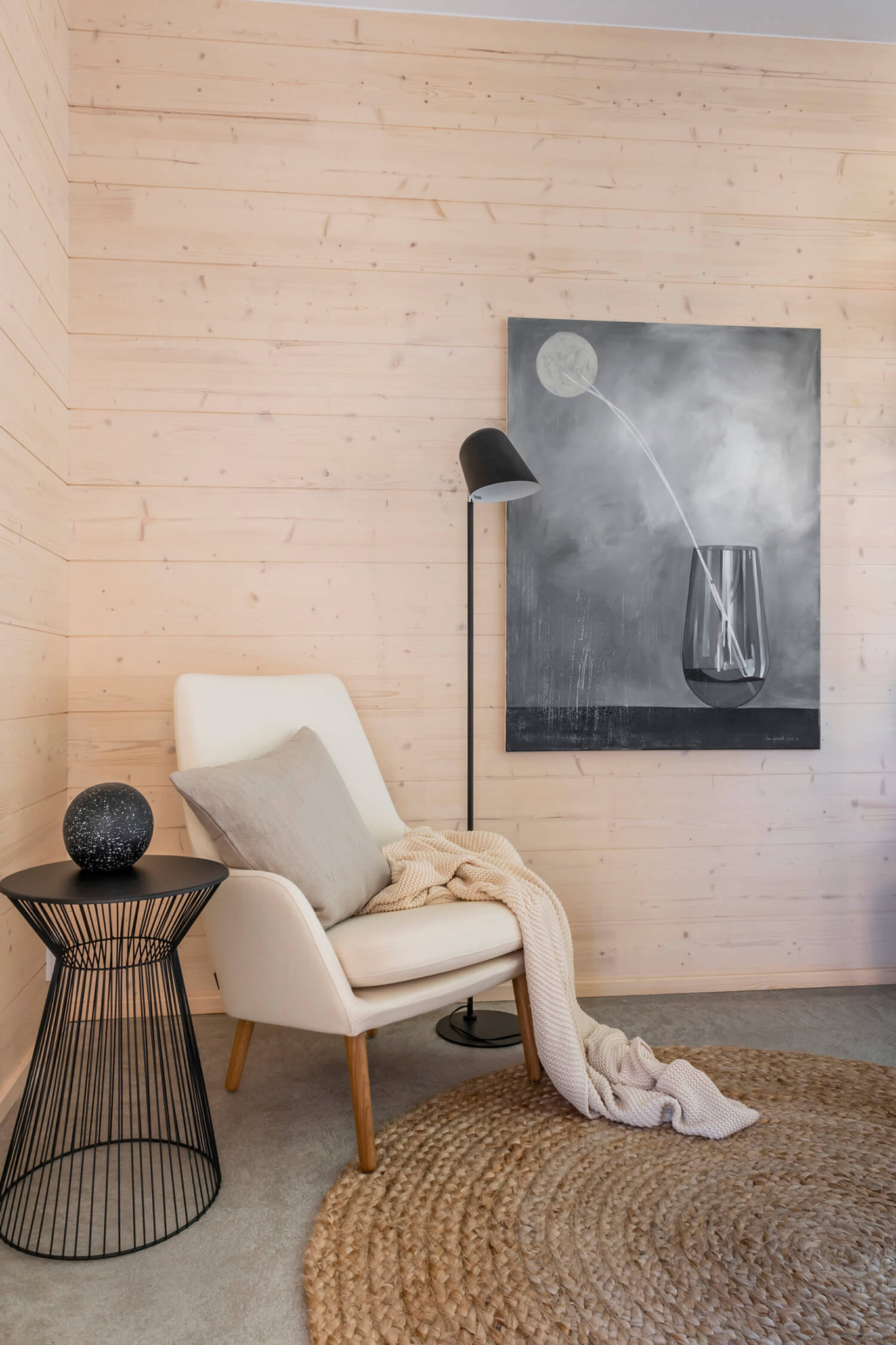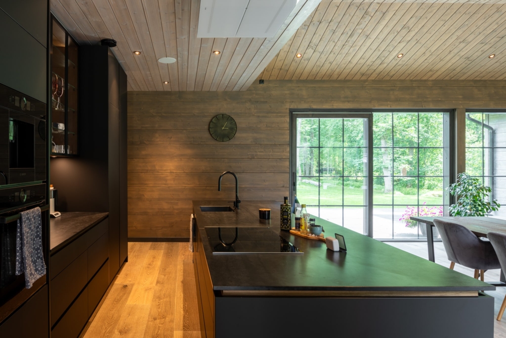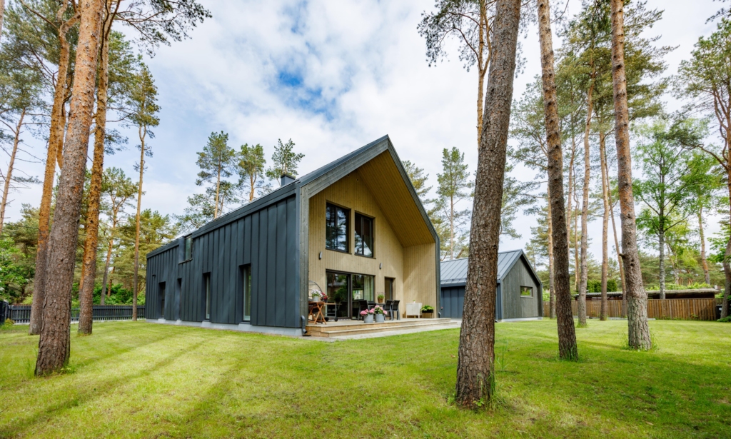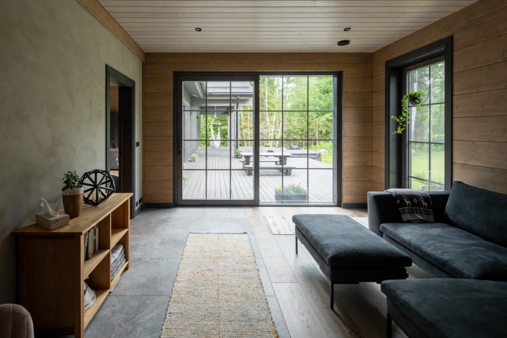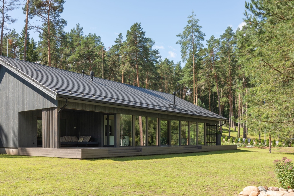 Rakennus on toteutettu laadukkaasta puusta, kantavat rakenteet ovat CLT:tä. Julkisivut ja terassit on verhoiltu lämpökäsitellyllä saarnilla, jonka sävy sulautuu täydellisesti ympäröivään mäntymetsään. Ajan myötä puu saa arvokkaan hopeanharmaan patinan, joka tekee talosta yhä luonnollisemman osan maisemaa.