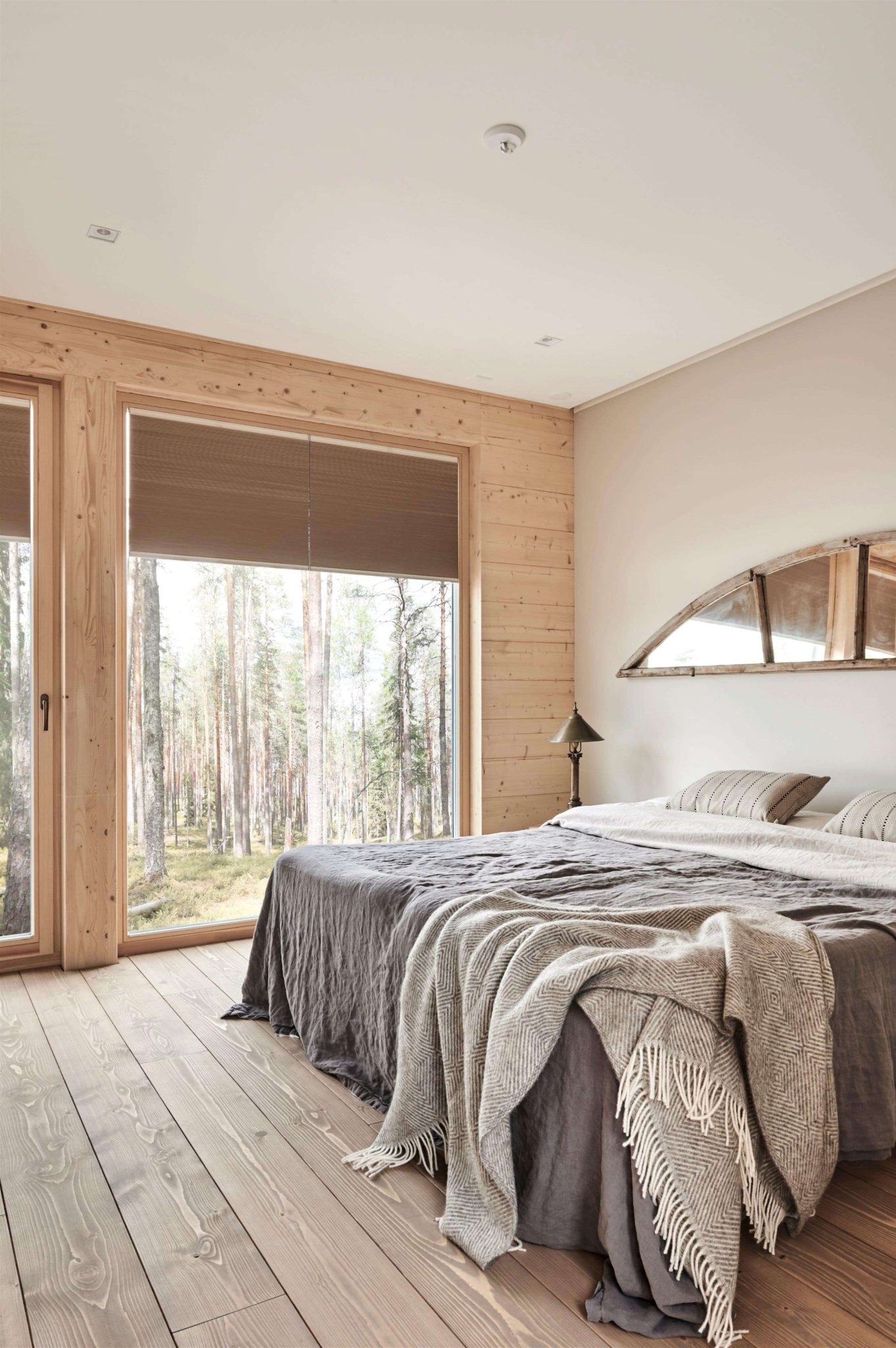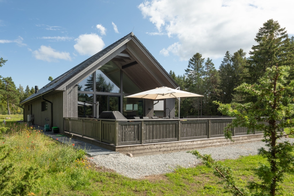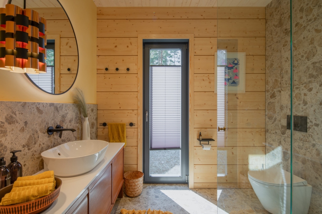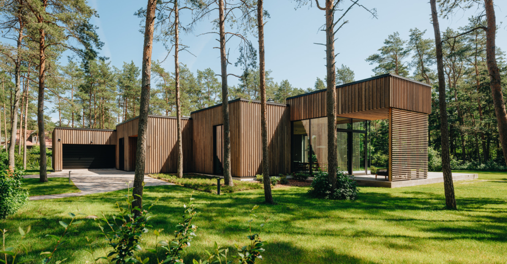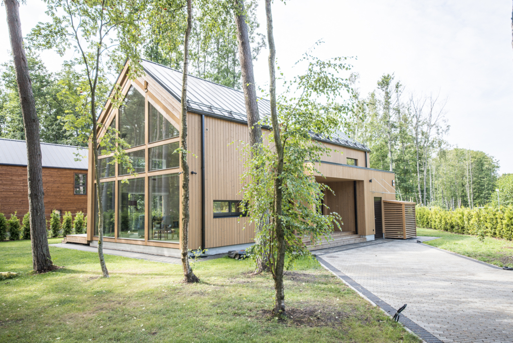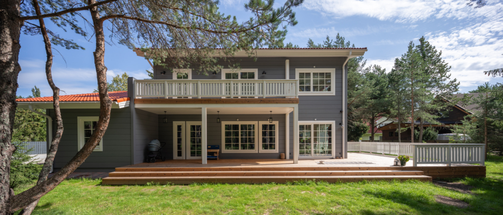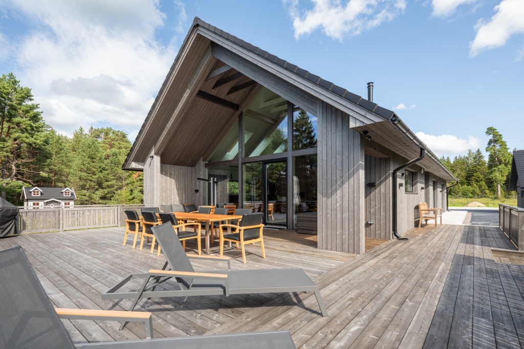 Rakennus on toteutettu laadukkaasta puusta, kantavat rakenteet ovat CLT:tä. Julkisivut ja terassit on verhoiltu lämpökäsitellyllä saarnilla, jonka sävy sulautuu täydellisesti ympäröivään mäntymetsään. Ajan myötä puu saa arvokkaan hopeanharmaan patinan, joka tekee talosta yhä luonnollisemman osan maisemaa.