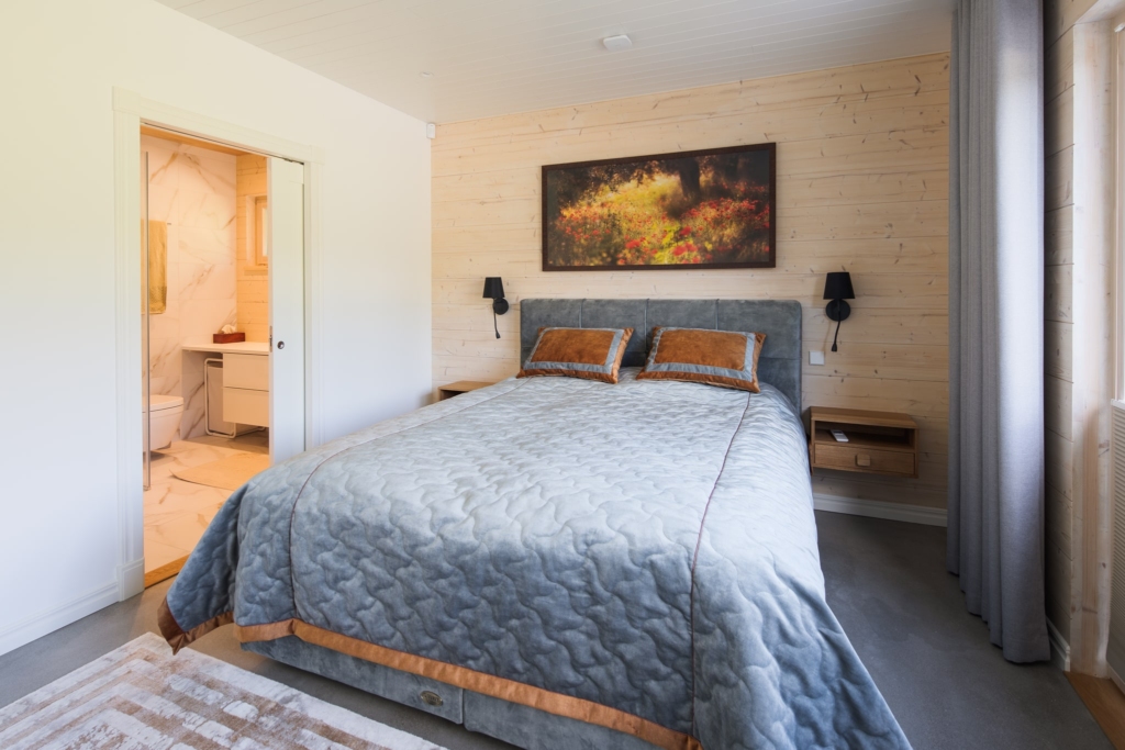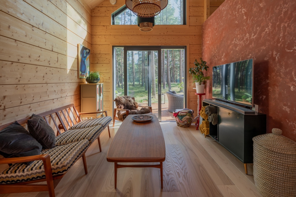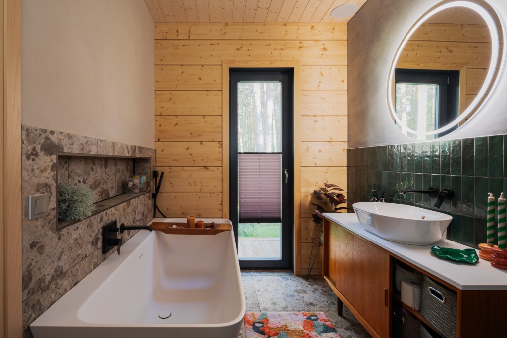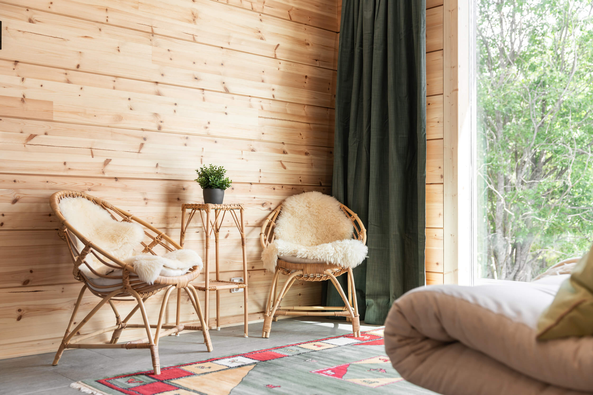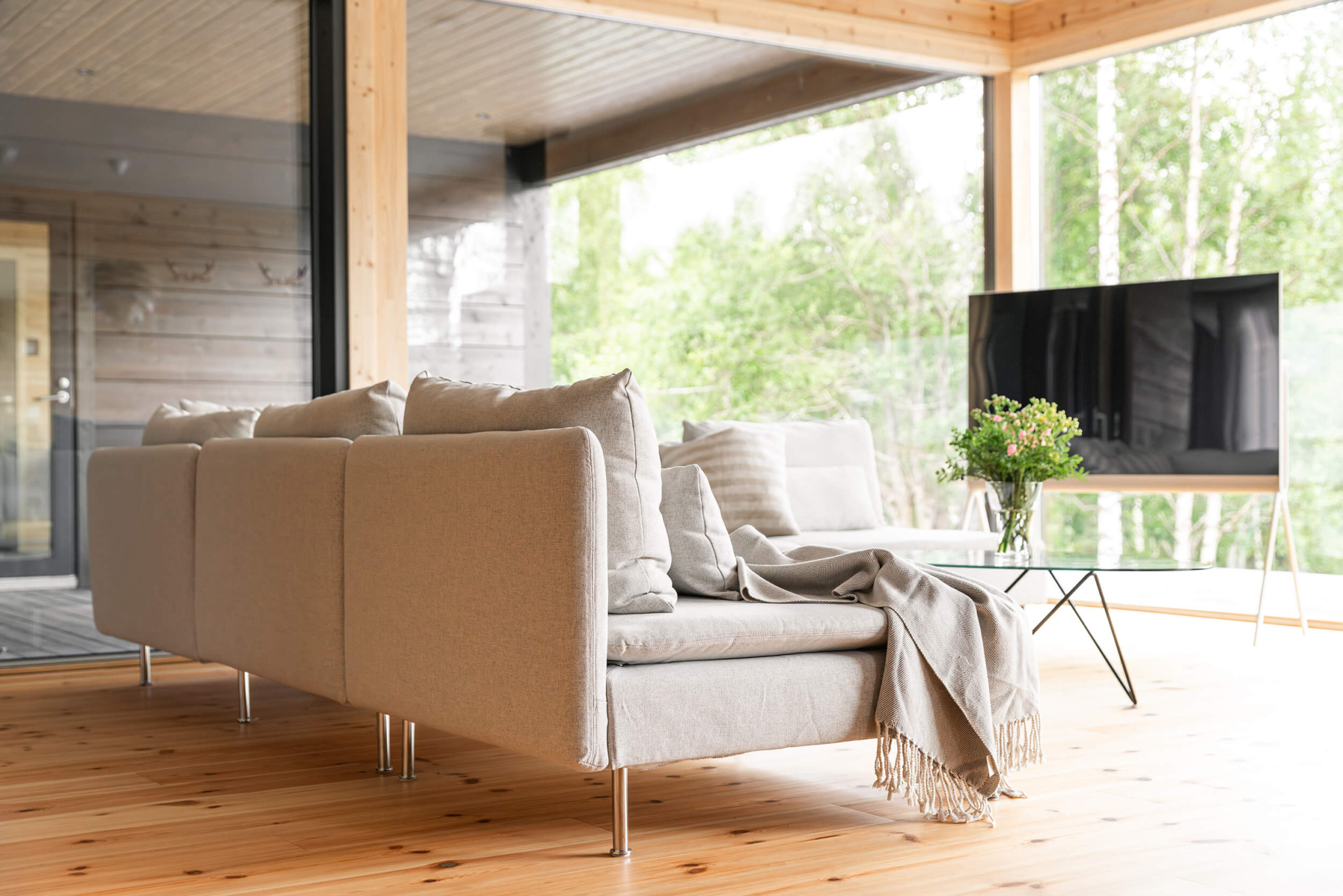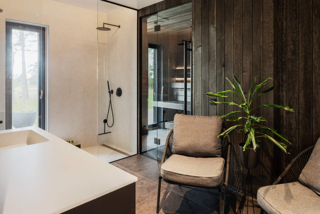 Rakennus on toteutettu laadukkaasta puusta, kantavat rakenteet ovat CLT:tä. Julkisivut ja terassit on verhoiltu lämpökäsitellyllä saarnilla, jonka sävy sulautuu täydellisesti ympäröivään mäntymetsään. Ajan myötä puu saa arvokkaan hopeanharmaan patinan, joka tekee talosta yhä luonnollisemman osan maisemaa.