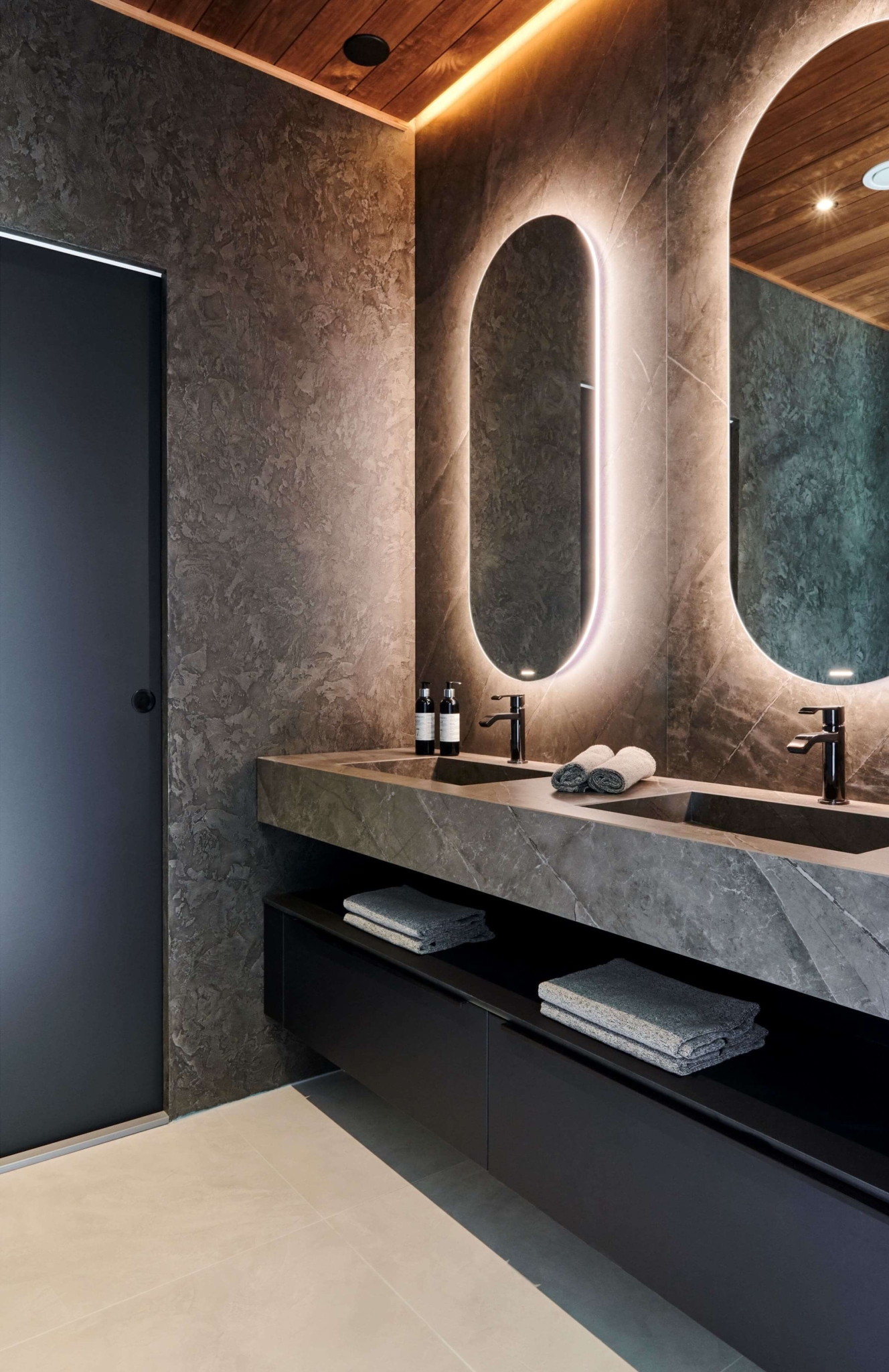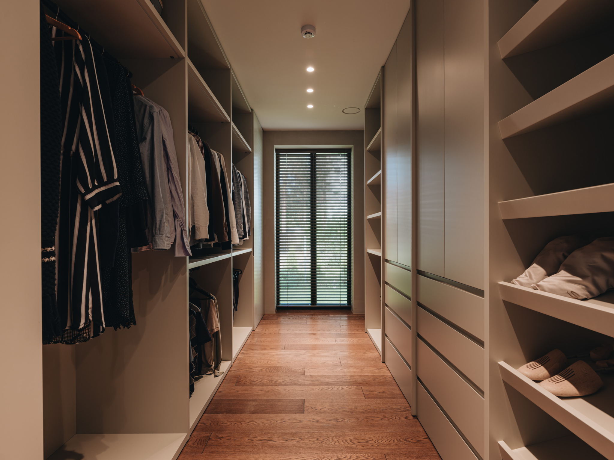 Kaksikerroksisessa kodissa sijaitsevat avara olohuone ja keittiö, neljä makuuhuonetta, apu- ja varastotilat sekä oma spa-osasto. Pystysuuntaiset kattoikkunat tuovat runsaasti luonnonvaloa portaiden viereiseen aulatilaan ja kylpyhuoneeseen.