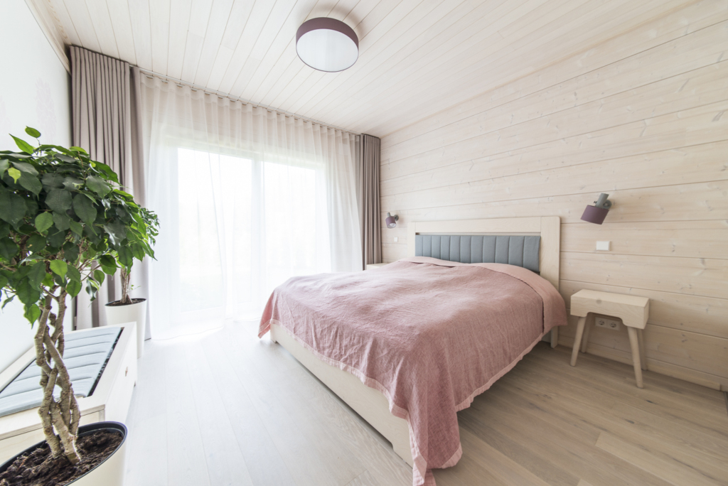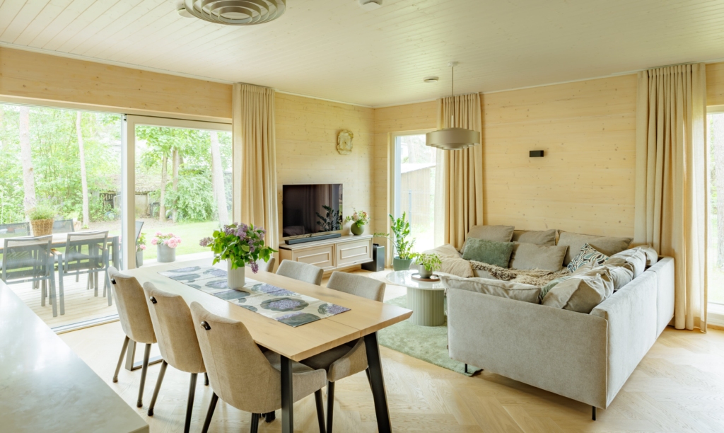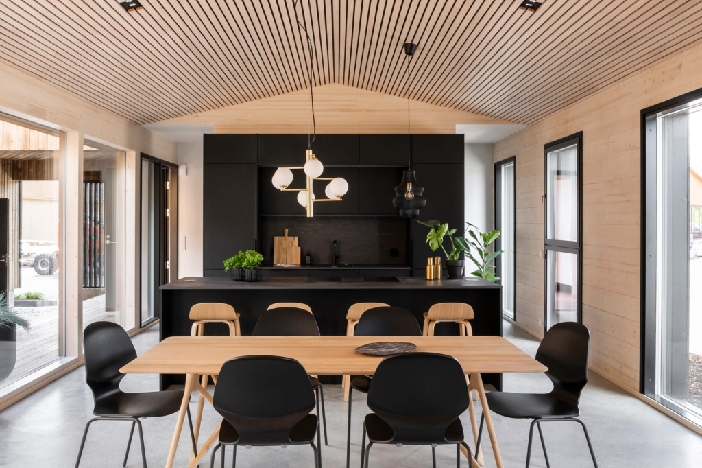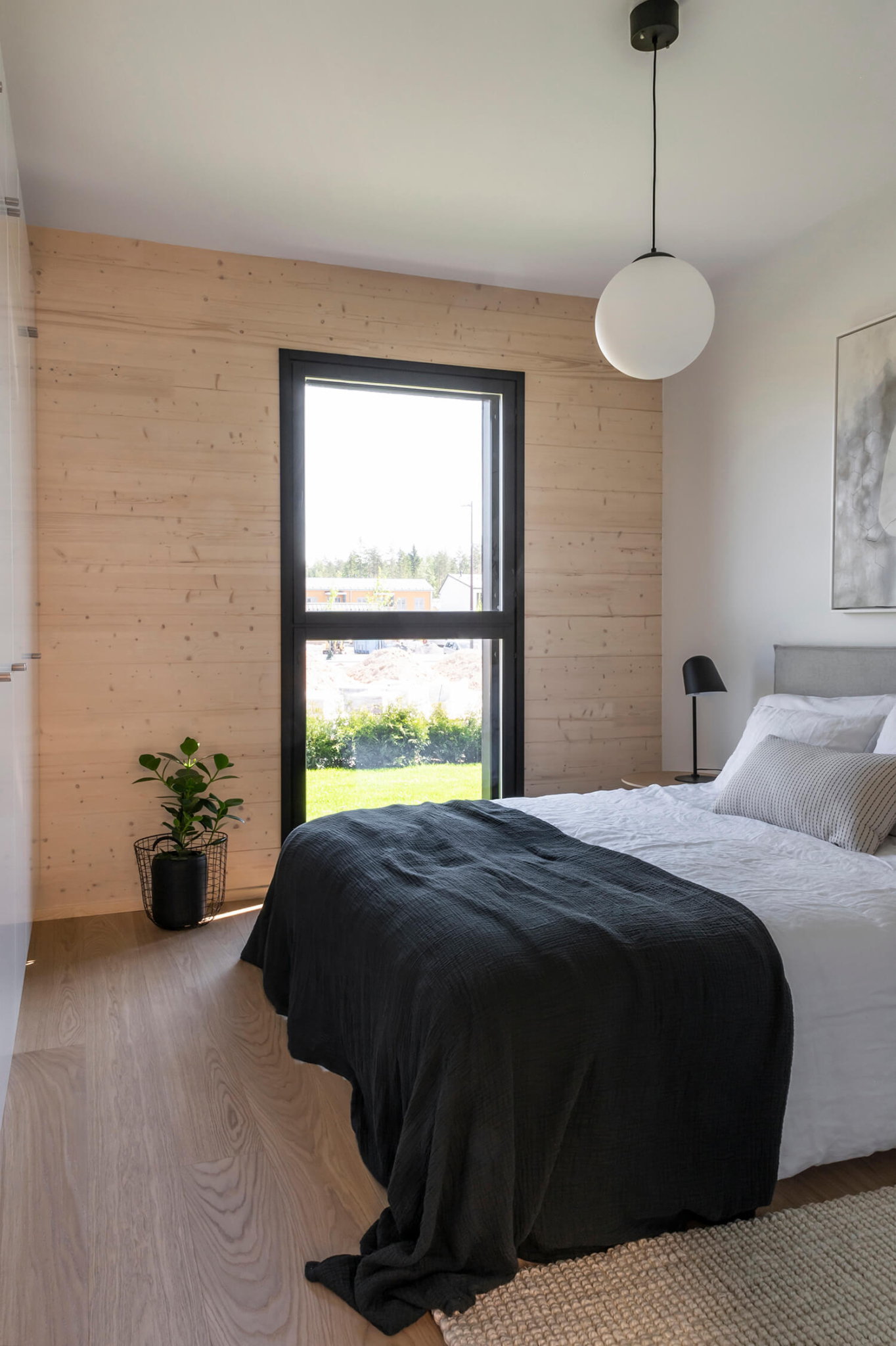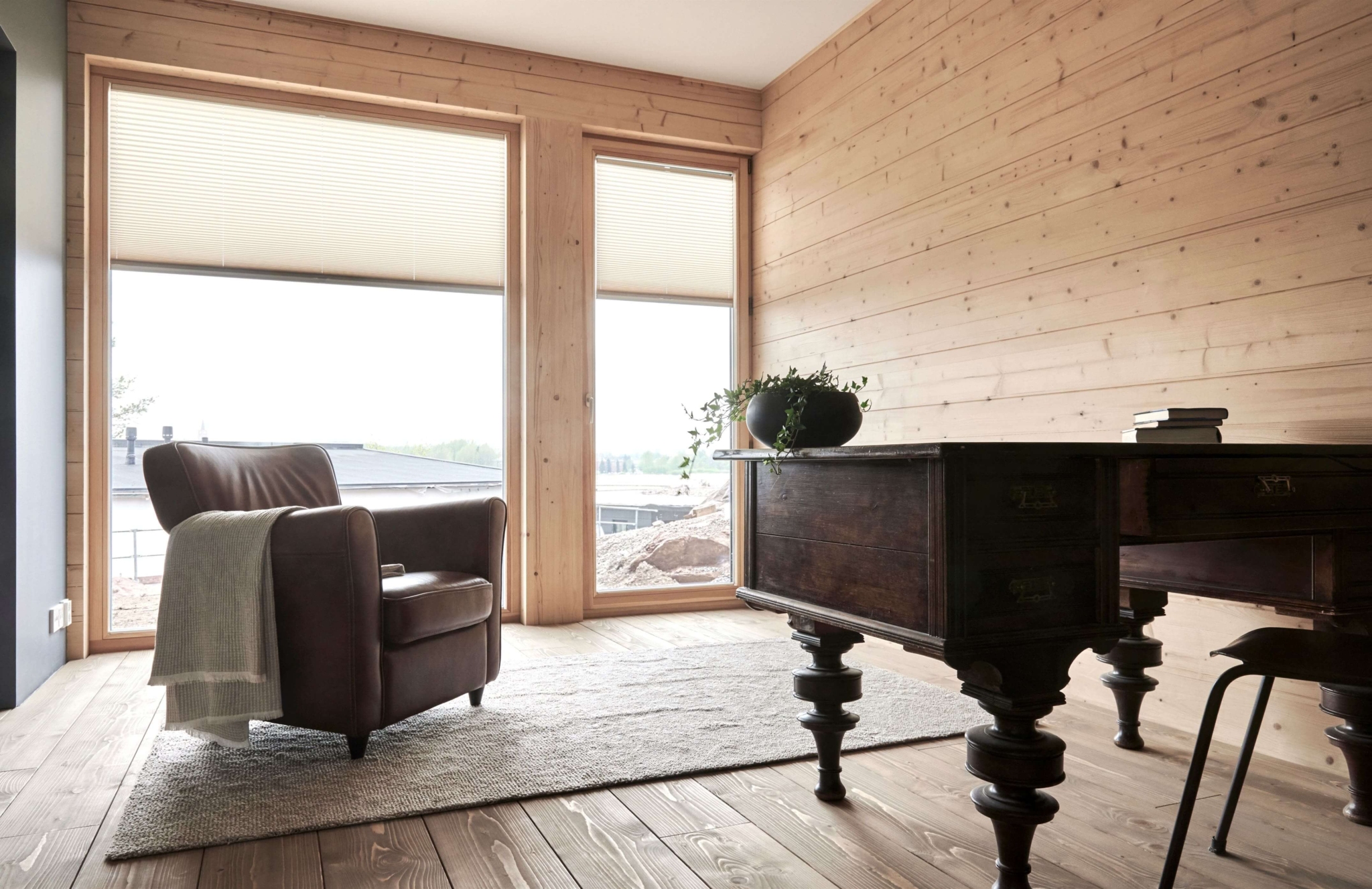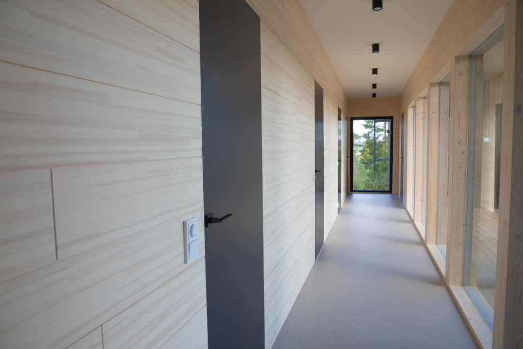 Petri halusi talon, jossa on täyspuinen julkisivu, mutta hirsiverhous tuntui vieraalta. Näin syntyi CLT:stä rakennettu talo, jossa on täyspuinen julkisivu ja sisäseinät. Myös rakennuksen väliseinät on tehty CLT:stä. Valoisan talon pohjaratkaisun suunnitteli Petri, ja Finnlog laati rakennuspiirustukset.