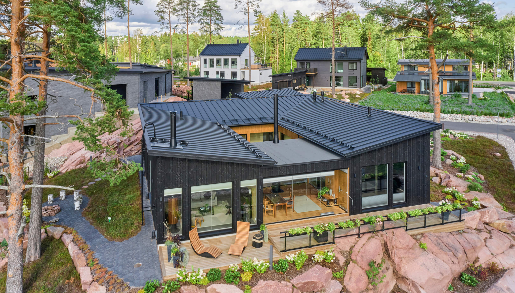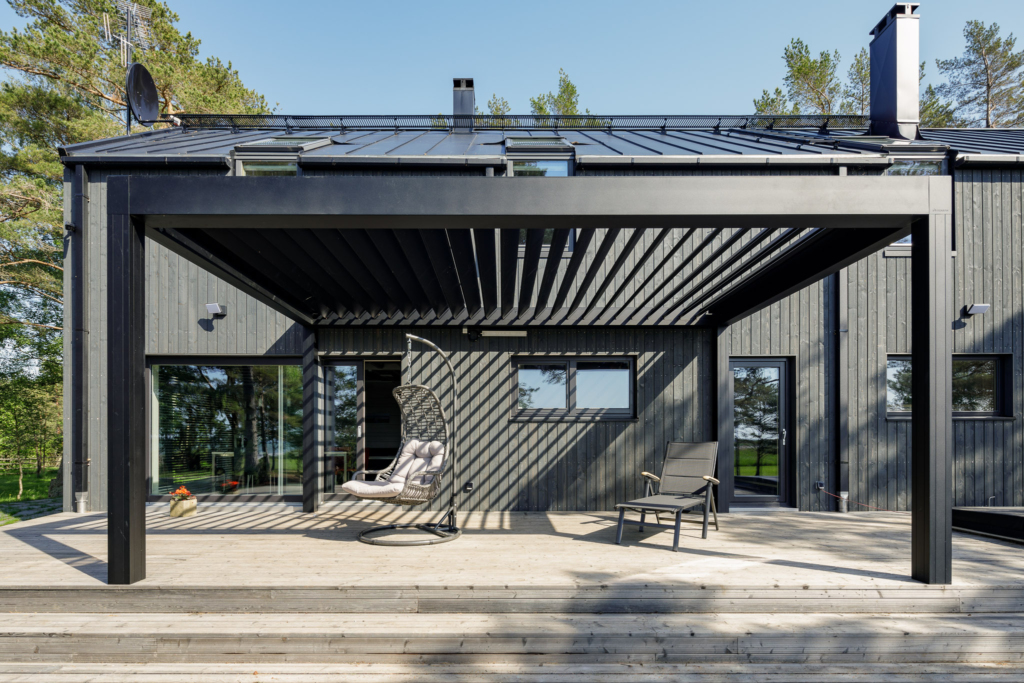Rakennuksen tumma peltijulkisivu ja katto muodostavat kontrastin päätyseinien vaalealle laudoitukselle. Sivuseiniä ja räystäitä on jatkettu, mikä korostaa talon persoonallista ilmettä. Samalla saadaan talon päätyihin toteutettua viihtyisät, katetut terassitilat.