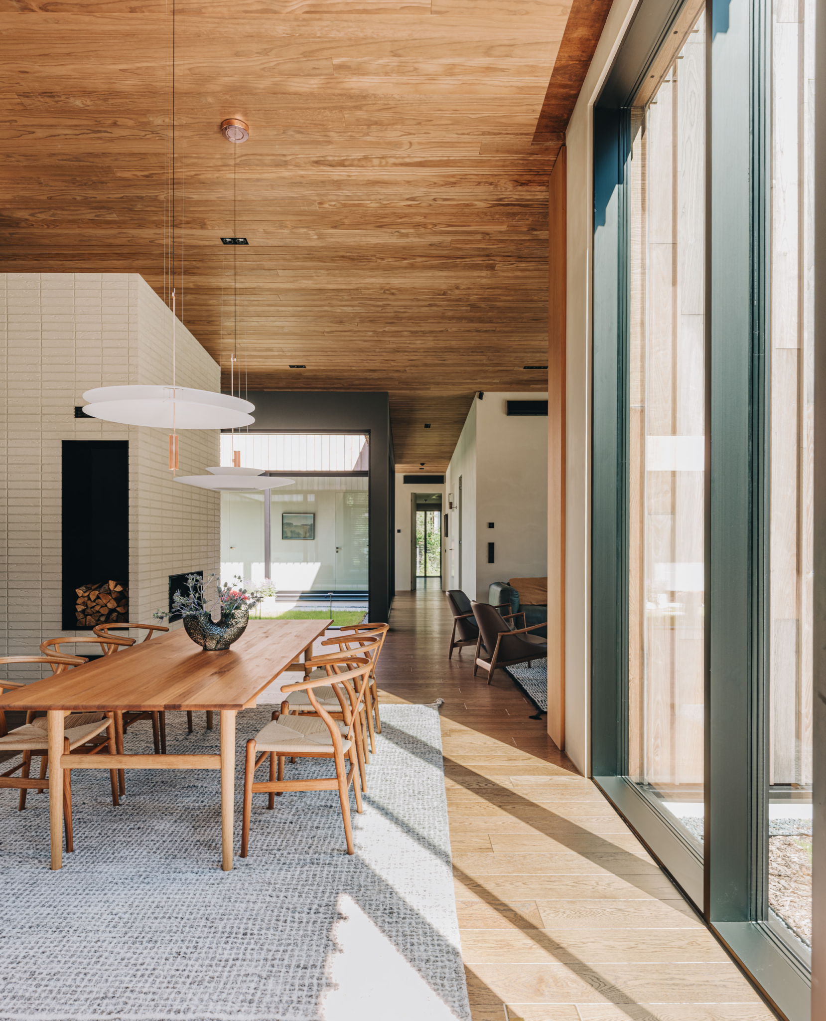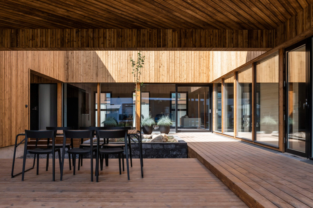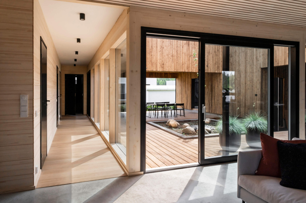 Yksikerroksisessa kodissa asuminen on mutkatonta ja vaivatonta. Sisätiloista on suora yhteys eteläpuolen terassille ja rakennuksen sydämeen, sisäpihalle. Tämä suojaisa ulkotila on rauhallinen keidas, johon tuuli ja katseet eivät yllä. Sen ympärille rakentuva käytävä yhdistää kaikki tilat harmoniseksi kokonaisuudeksi. Sisäpiha tarjoaa alati vaihtuvan elämyksen: valo, sää ja vuodenajat tekevät siitä jatkuvasti uudenlaisen osan arkea.