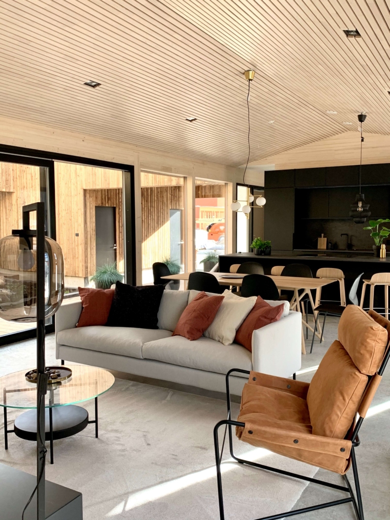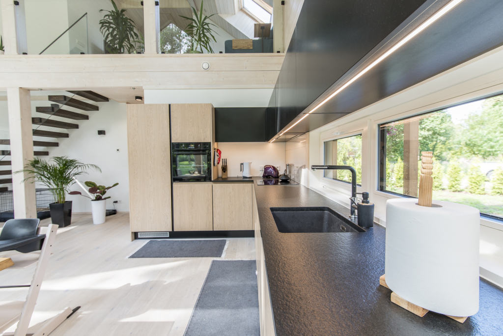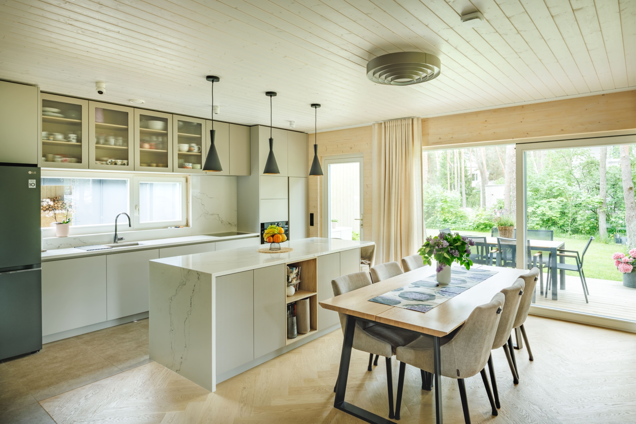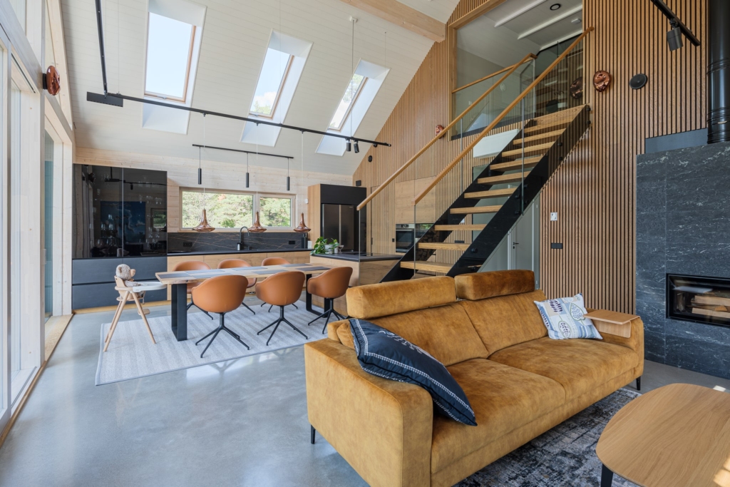 Yhteistyön tuloksena syntyi kolmen tilavan makuuhuoneen talo, jossa on kaikki tarvittavat lisätilat. Talon kruununjalokivi on avoin ja valoisa keittiö-olohuone, joka ulottuu kattolinjaan asti.