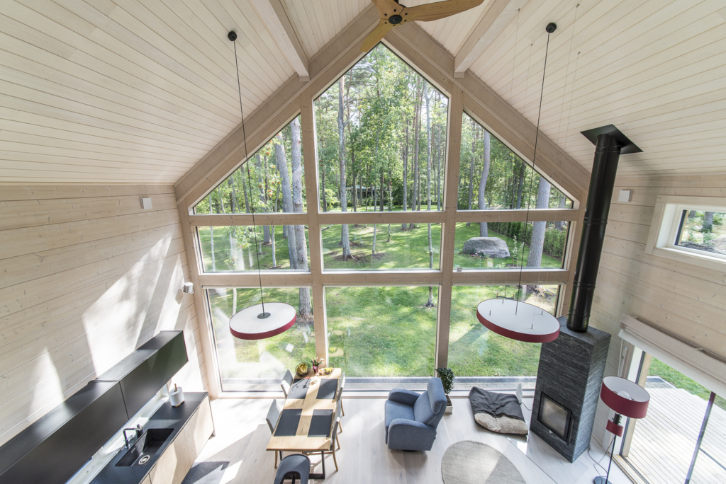 Päätykolmion lasiseinä huomioi täydellisesti asiakkaan toiveet, tontin näkymät ja ilmansuunnat.