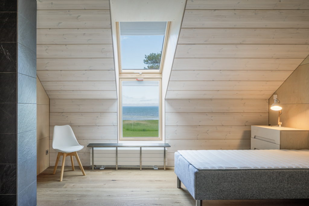 Selkeälinjainen, harjakattoinen omakotitalo on suunniteltu merellinen maisema huomioon ottaen. Talo sijaitsee rannalla, ja suunnittelussa huomioitiin myös asiakkaan toiveet – asiakas halusi esimerkiksi talon yhteyteen suunnitellun venevajan.