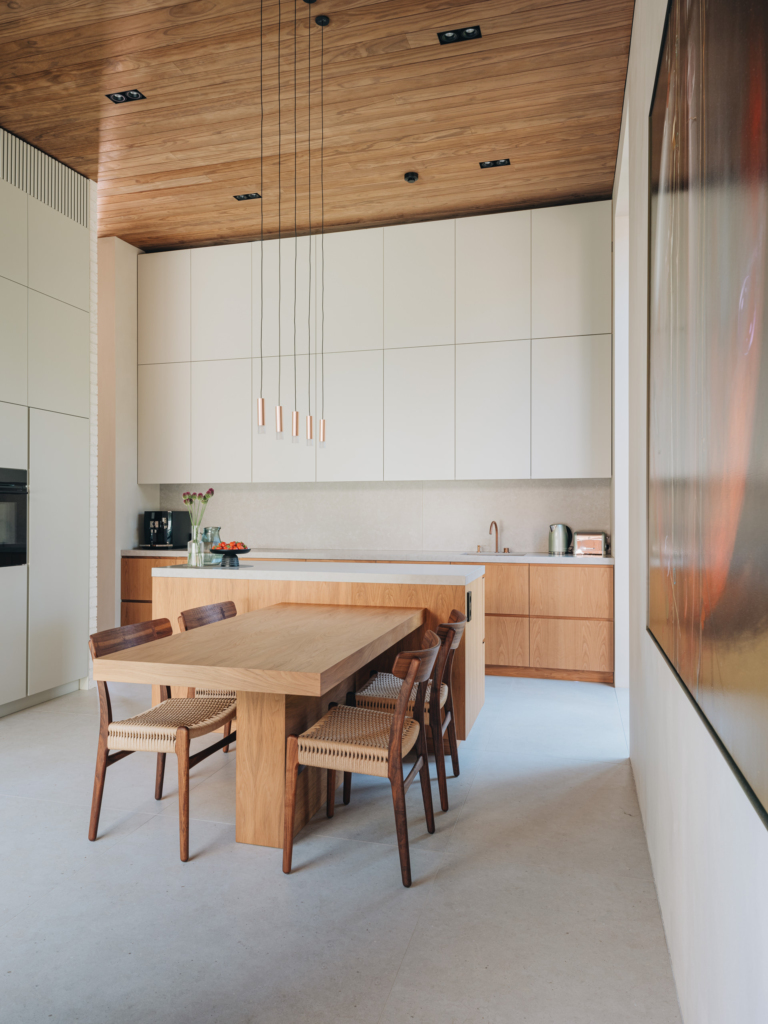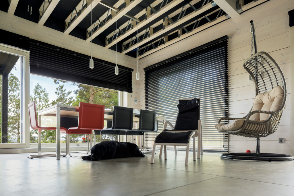 Alakerran lattiat on jätetty urbaanin rouheiksi – ne ovat käsittelemätöntä betonia. Metallia ja puuta yhdistelevät välipohjan palkit on jätetty näkyviin olohuoneessa. Puu on pääosassa yläkerran
