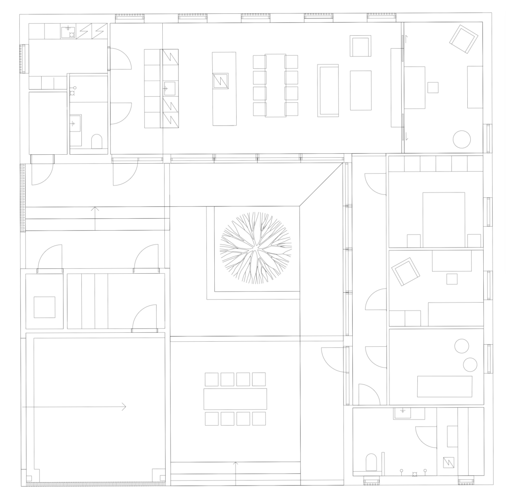 Finnlog Hetenalle on pyritty kehittämään mahdollisimman hyvin toimiva pohjaratkaisu, joka on atriumtalon perusratkaisulle ominainen ja jossa tilat liittyvät luontevasti ja vaivattoman oloisesti toisiinsa. Rakennus jakautuu vyöhykkeittäin julkisemmista asumisen tiloista yksityisempiin. Aputilat on sijoitettu päätilojen yhteyteen helposti käytettäviksi, mutta kuitenkin niin, etteivät ne häiritse talon päätiloja, mikä mahdollistaa talon asukkaille sujuvan arjen. Sisätilojen sydämen muodostaa atriumpihaan isoin liukulasiovin avattava avoin olohuone-ruokailutila-avokeittiö. Olohuoneesta liukuovin rajattava ylimääräinen huone talon nurkassa voi toimia esimerkiksi kotitoimistona, tarjoten hyvät mahdollisuudet etätyöhön. Talon joustava rakenne ja pohjaratkaisu mahdollistavat makuuhuoneiden lisäämisen muuttuvien elämäntilanteiden mukaan. Talon asuinosan pihanpuoleisessa päässä sijaitsee sauna, josta on lyhyt matka vilvoittelemaan katetulle terassille atriumpihan ja vehreän takapihan väliin.