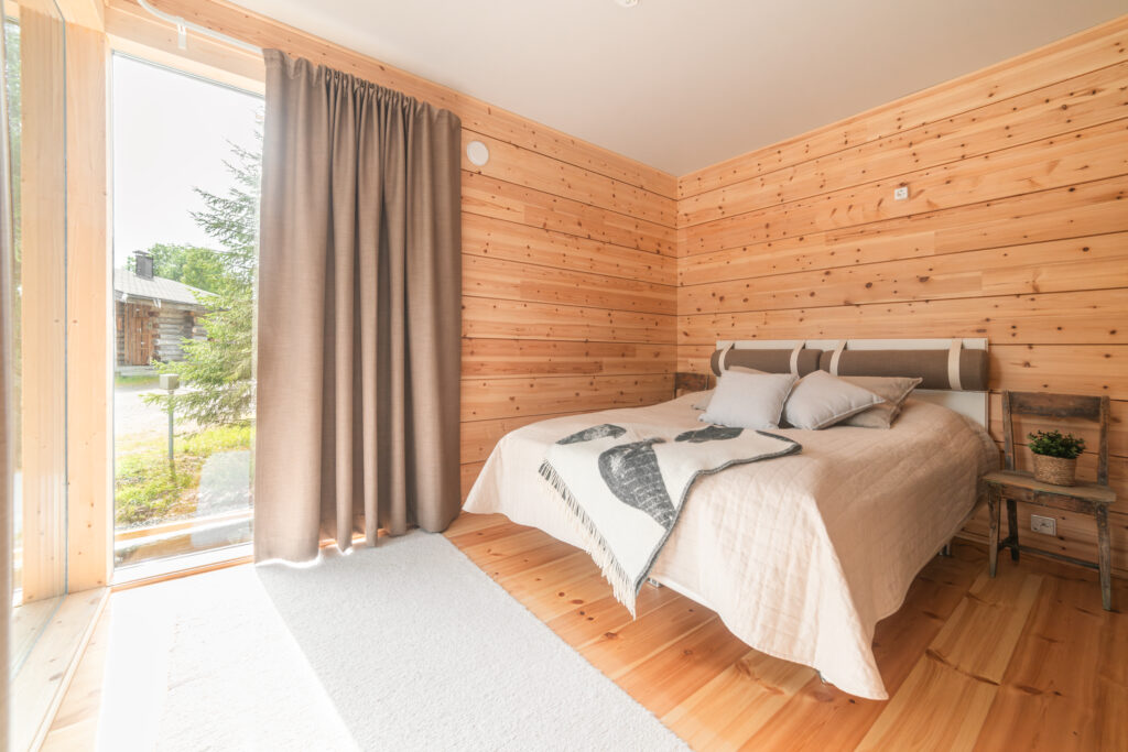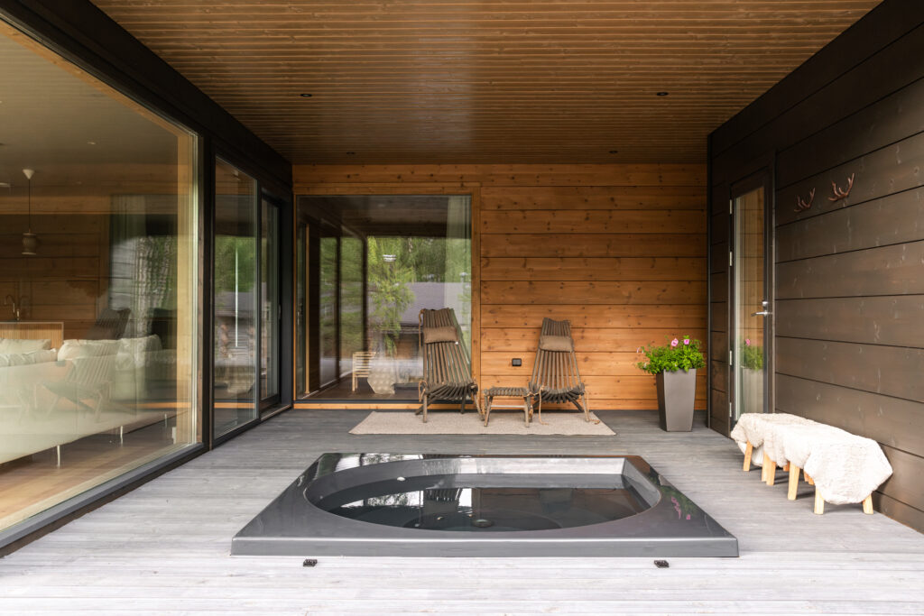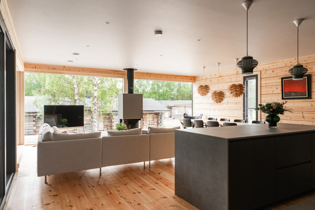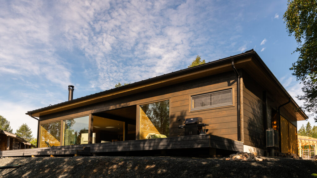 Loma-asunnon suurissa, näyttävissä lasipinnoissa on hyödynnetty timber frame -tekniikkaa, jonka avulla puurakenteiseen taloon pystyy asentamaan aiempaa suurempia lasipintoja.