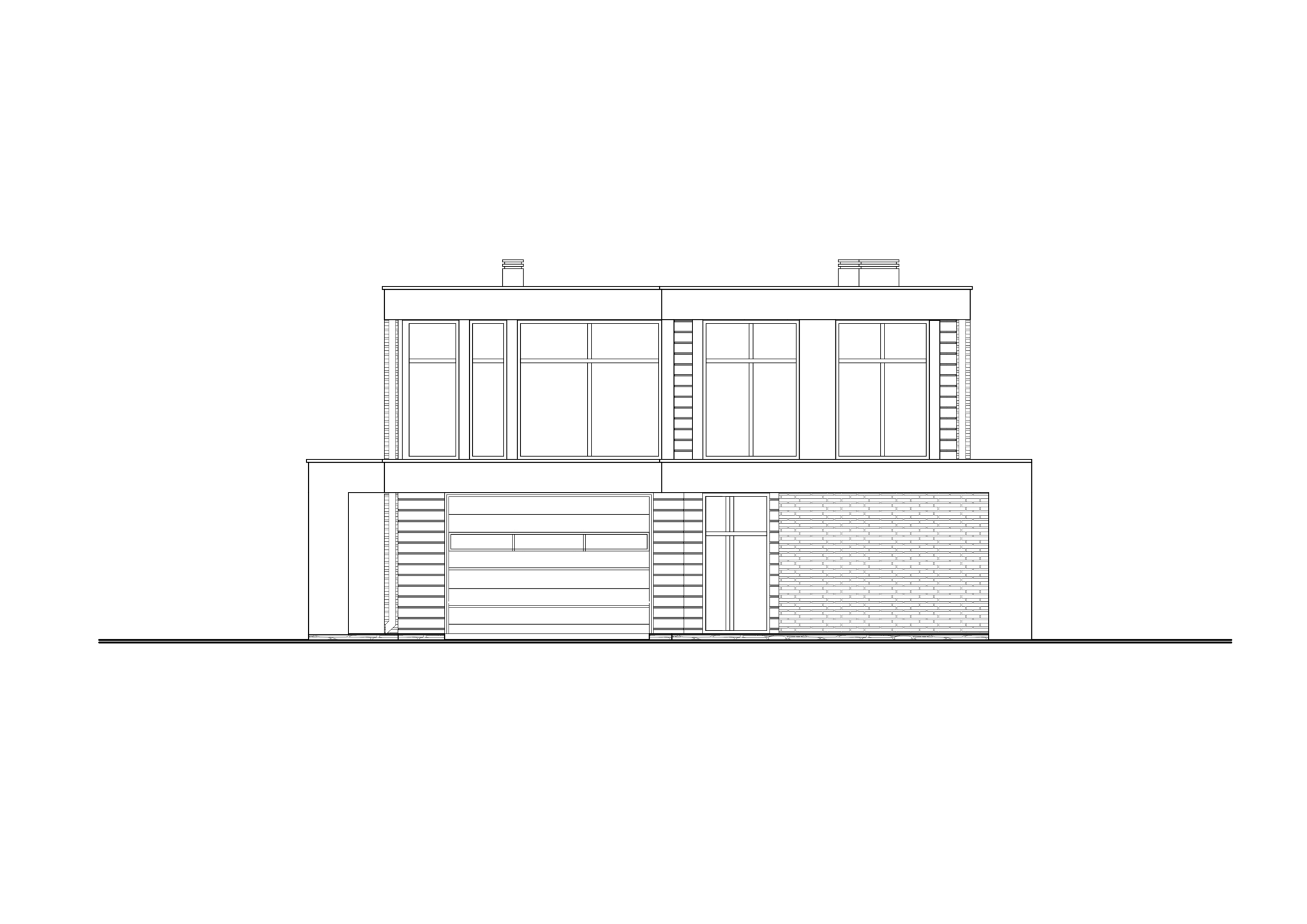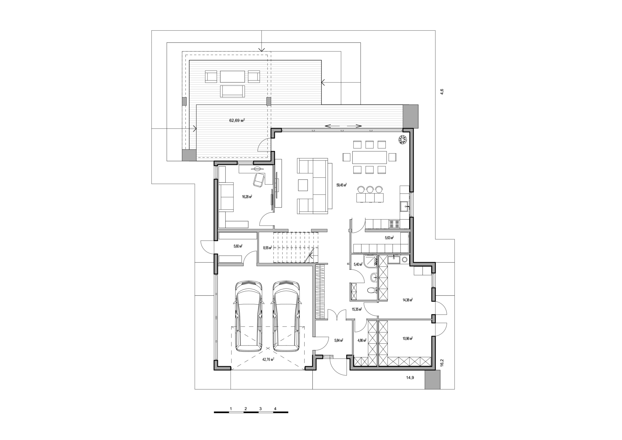 Tilava olohuone jakautuu kolmeen osaan: seurustelu- ja rentoutumisalue yhdistyy keittiö- ja ruokailutilaan. Olohuoneesta on yhteys myös työhuoneeseen. Eteishallista pääsee kahden auton autotalliin sekä kodinhoitohuoneeseen.