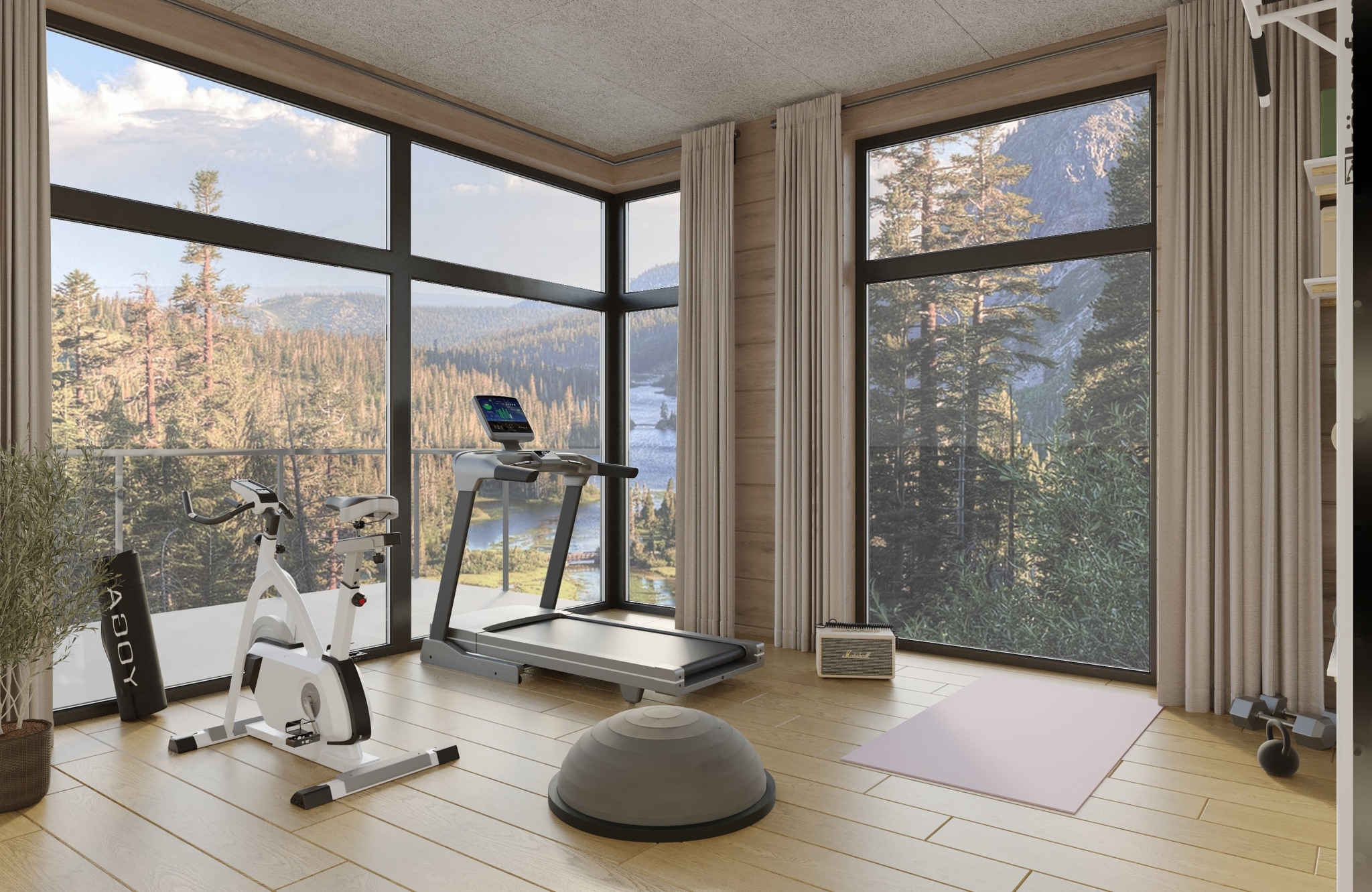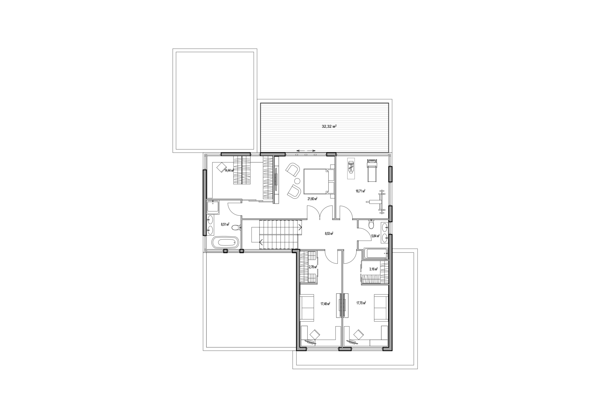 Toisessa kerroksessa on kolme makuuhuonetta sekä kuntosali. Päämakuuhuoneessa on oma vaatehuone, kylpyhuone sekä käynti suurelle näköalaterassille.