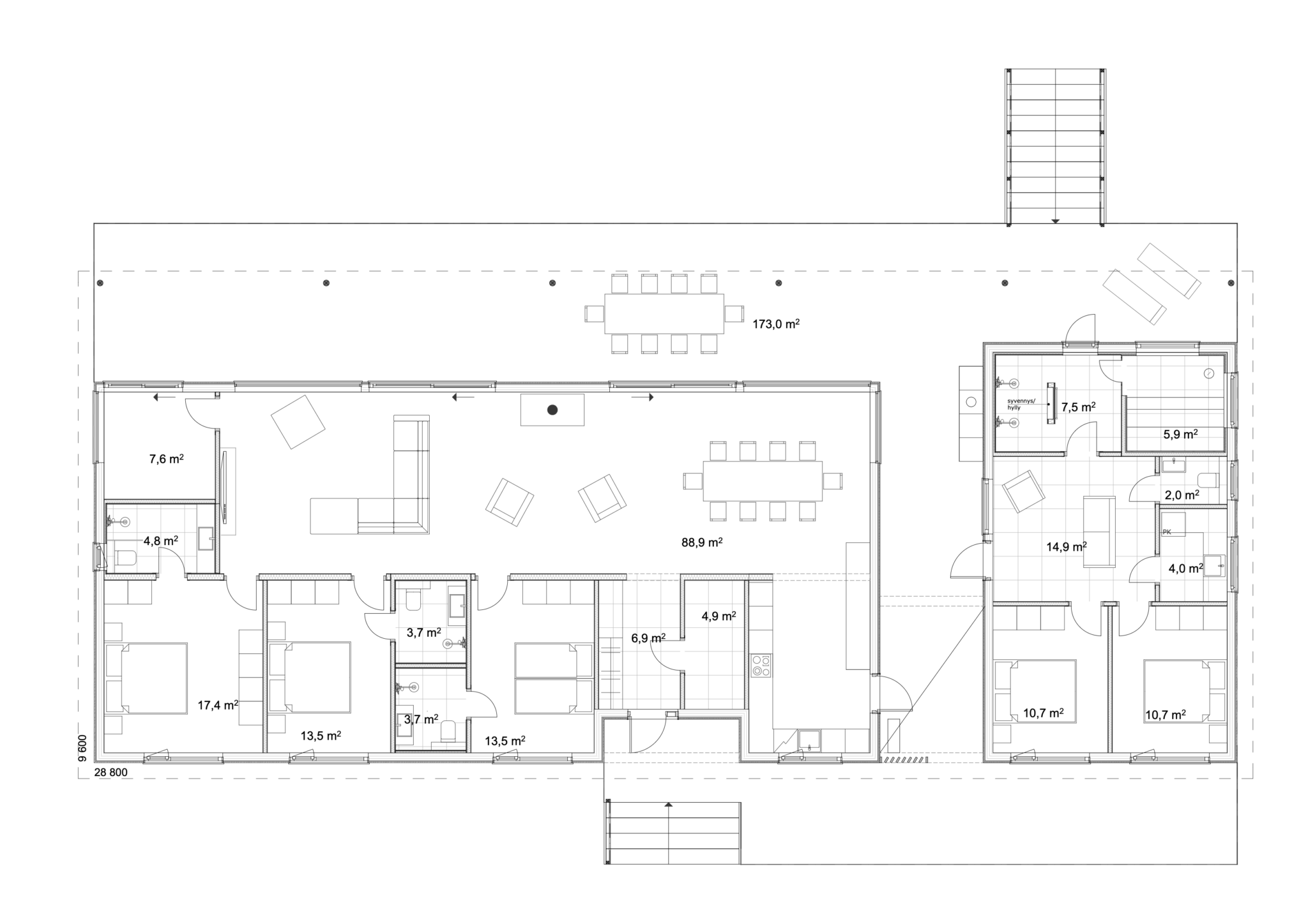 Erilliseen saunarakennukseen kuuluu saunan lisäksi kodinhoitohuone, olohuone ja kaksi makuuhuonetta. Huoneiden käyttötarkoitus voidaan muuttaa perheen toiveiden mukaan joko harrastushuoneeksi, yrityksen toimitiloiksi, vierashuoneeksi tai keittiön lisäämällä erilliseksi asuintilaksi.