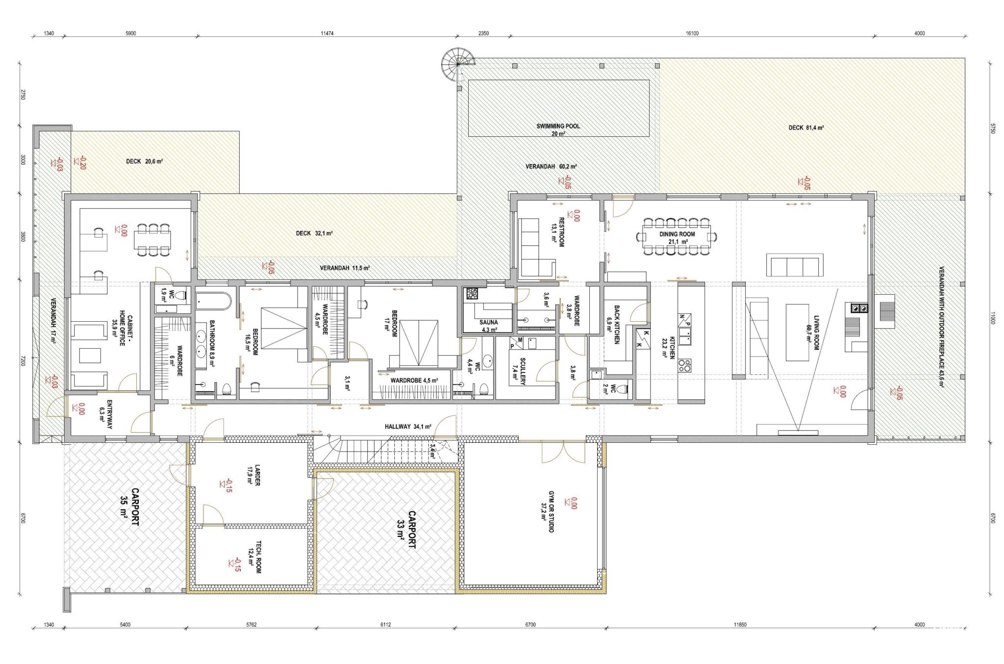 Käytävän pituutta voi muokata kodin omistajan toiveiden ja tarpeiden mukaan. Käytävää pidennetään tai lyhennetään haluamasi huonemäärän ja lattiatilan mukaan. Olohuoneen ja keittiö koko on myös säädettävissä.